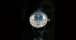 萬萬想不到,第一屆Time to Move最厲害最史無前例的複雜款式,是GO這一枚陀飛輪。近年多了品牌做出停秒陀飛輪,朗格、積家、IWC、Moritz Grossmann等等都先後成功開發出自家的停秒機制。GO的Senator Chronometer所用的Caliber 58-01機芯,早就已經有自家一套停秒、歸零及分鐘鎖定(minute detent)的系統,今次這枚Senator Chronometer Tourbillon就成功將這套系統結合飛行陀飛輪。錶冠拉出一格,機制便會利用垂直離合器鎖停陀飛輪框架,即時煞停擺輪,此時再將錶冠拉出一格,連住秒針的陀飛輪框架會整個旋轉至歸零,分針這個時候亦會整格移前下一個刻度,這樣便可確保調校時間時分與秒是在一個絕對同步的狀態。整個系統還加入了一個旋轉阻尼器(damper)於8點位置,用以確保整套制停系統順利運作。這台58-05手上鍊飛行陀飛輪機芯擁有70小時動力儲備,在9點位置有動力儲備顯示器,機芯更經過15天在五個不同位置及三種不同溫度下的嚴格測試,有天文台錶認證,也達至德國校準服務機構(German Calibration Service)所制訂的 DIN 8319標準。腕錶用42毫米鉑金錶殼,電鍍藍色錶盤,藍寶石水晶秒鐘刻度環,還有令人目不暇及的手工裝飾與格拉蘇蒂條紋飾面。錶盤正面看當然已經很漂亮,但斜看更不得了,你會先到藍色錶盤和飛行陀飛輪高出一級,整個錶面層次分明,12點位置的內錶緣更以鏡面顯示「Chronometer Tourbillon」字樣。腕錶售價約$1,269,000。