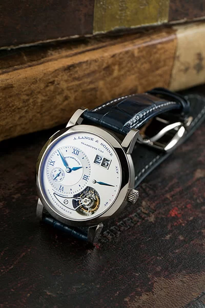 LANGE 1 TOURBILLON “25th Anniversary” 直徑38.5毫米白金錶殼,配實心銀銀白色錶盤及藍鋼指針,具備時、分顯示及小秒盤;功能包括停秒裝置的一分鐘陀飛輪、朗格大日曆顯示、AUF/AB動力儲備顯示;陀飛輪夾板經黑色表面拋光處理(Black Polishing);配藍色手工縫製鱷魚皮革錶帶。用朗格L961.4手上鍊機芯,德國銀製夾板,手工雕刻藍色中間輪夾板及陀飛輪夾板,中間輪夾板鐫刻朗格大日曆顯示,有72小時動力儲備。限量25枚。售價約$1,304,000。