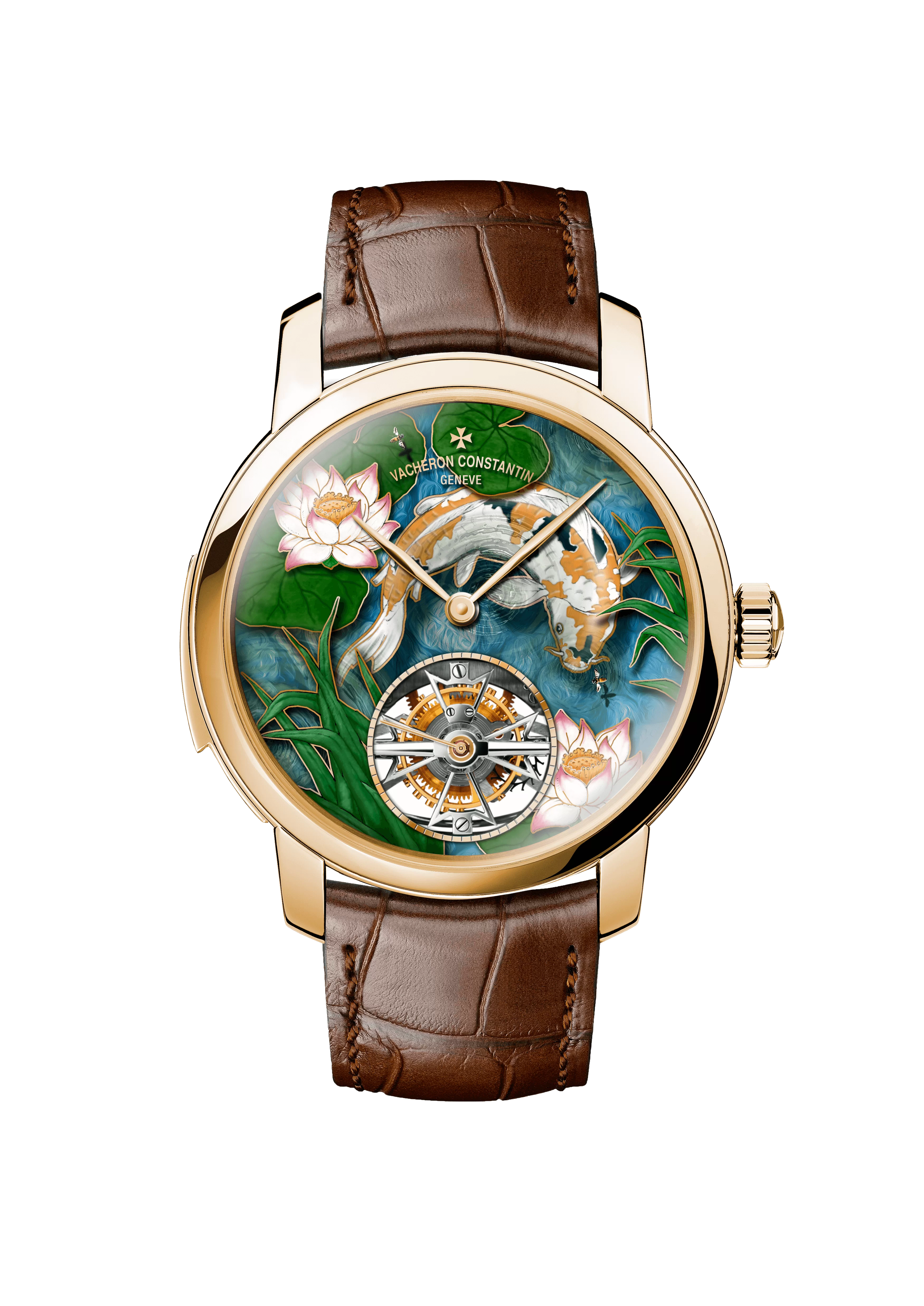 三問陀飛輪 Four seasons腕錶是四枚獨一無二的三問陀飛輪,彰顯了江詩丹頓製錶工藝的豐富特色。四枚時計傑作巧妙地運用手工雕刻和琺瑯工藝,精心呈獻融入自然主義藝術的錶盤。錶盤裝飾以四季色彩為背景,生動描繪錦鯉於水中暢遊的靈動姿態,展示了高超的藝術工藝。每個錶盤至少需要60個小時的精心雕刻,才能於1.35毫米的厚度間營造出縱深效果。腕錶搭載2755 TMR手動上鍊機械機芯,約58小時動力儲存,配備精密陀飛輪裝置及展現品牌高超技藝的三問報時功能。