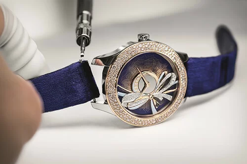 Grand Bal Ruban是今年Dior Grand Bal系列的全新成員,錶盤擁有別緻的全新設計。同樣從高級訂製服得到靈感,Grand Bal Ruban特別設計出蝴蝶結造型擺陀,以規律節奏重現晚禮服裙擺翩翩搖曳的回旋之姿。蝴蝶結常見於Dior高級訂製服的細節上,如領口線條、圓潤臀線與高跟鞋的位置等等。Grand Bal Ruban的錶圈有雪花密鑲鑽石妝點,配搭玫瑰金鋼錶殼,蝴蝶結造型靈動優美,飾上baby blue色調的彩漆,藍色錶盤飾以金線,襯上旋動的蝴蝶結更顯魅力,錶背更特別加入虹彩設計,令人驚喜。腕錶限量88枚,售價待定。同系列其實還有一款更漂亮的淡粉紅羽毛版本,但要等到今年稍後時間才推出,到時我們再為大家介紹。