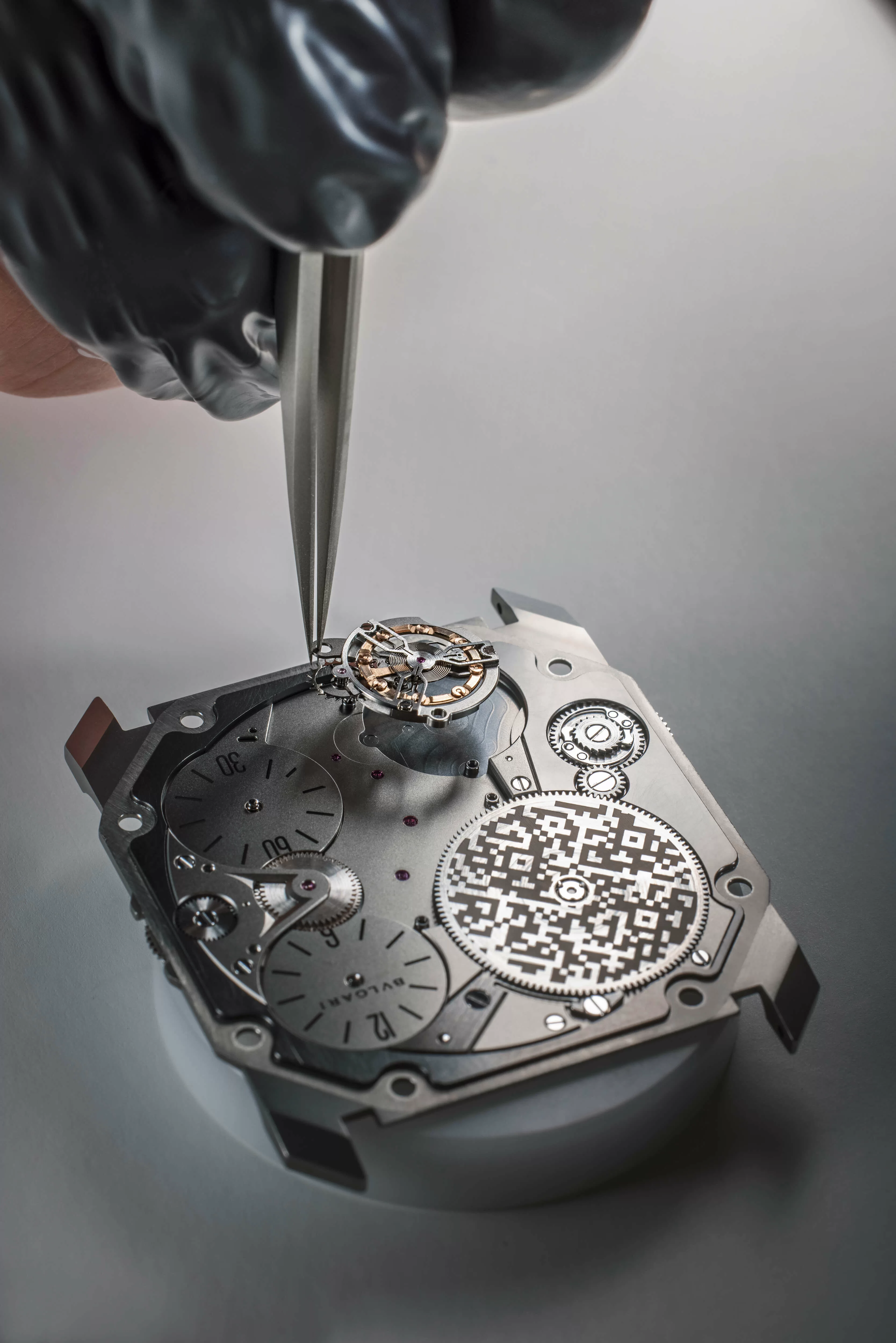 Octo Finissimo Ultra 仍承襲系列所有特色,包括設計的簡約純粹與優雅氣質,以噴砂鈦金屬打造直徑40毫米的八角形錶殼,搭配與錶殼厚度相同的整合式錶帶。偏心秒針盤設於 6 時位置,另搭載小時盤和分針小錶盤。此巨大壯舉需由多個技術團隊組成的小組,在BVLGARI位於瑞士侏羅山谷 (Vallée de Joux) 與納沙泰爾 (Neuchâtel) 腕錶工坊齊心投入長達3年的研究與開發;而位於拉紹德封 (La Chaux-de-Fonds) 的先進機芯開發專家 Concepto錶廠也有參與其中。