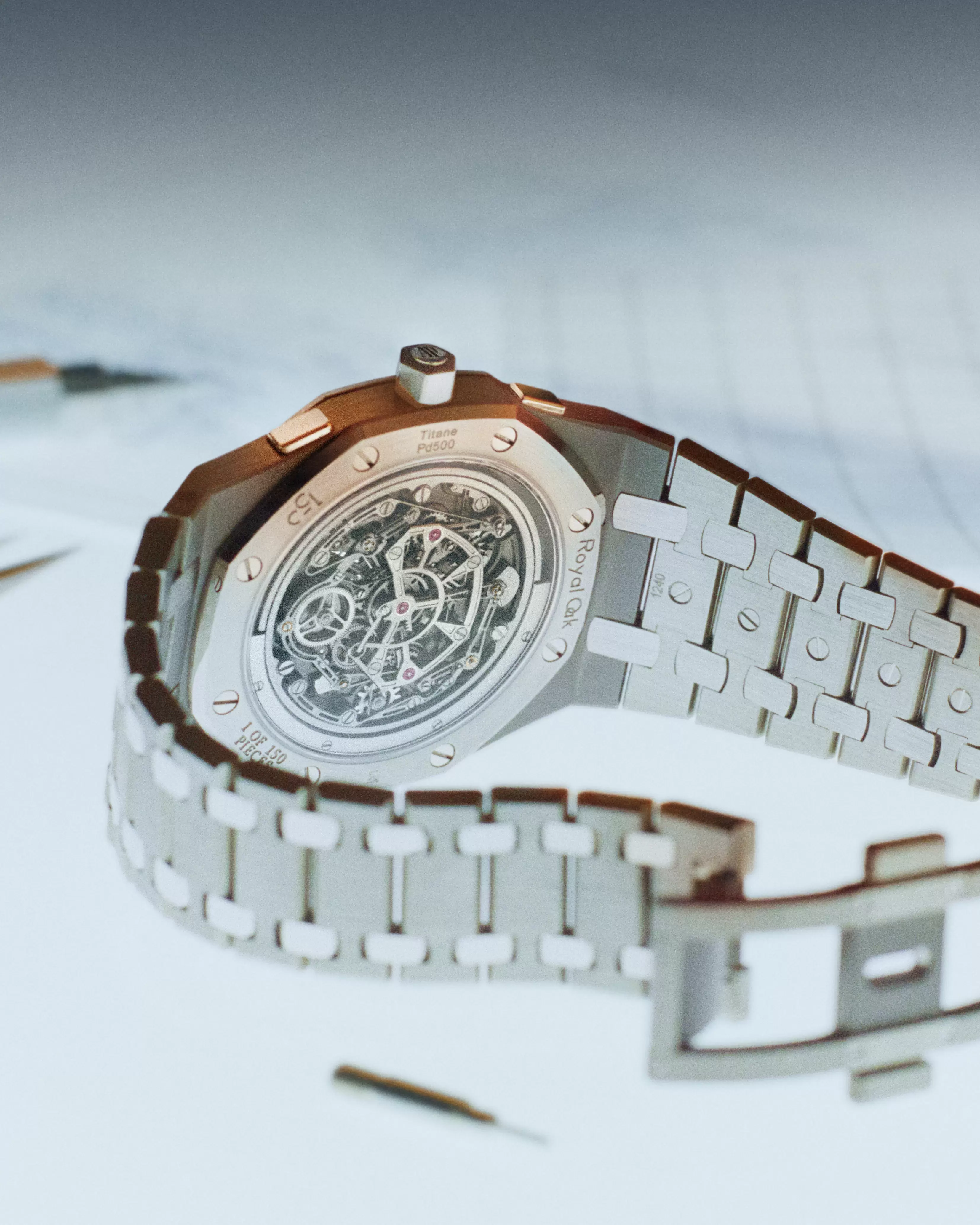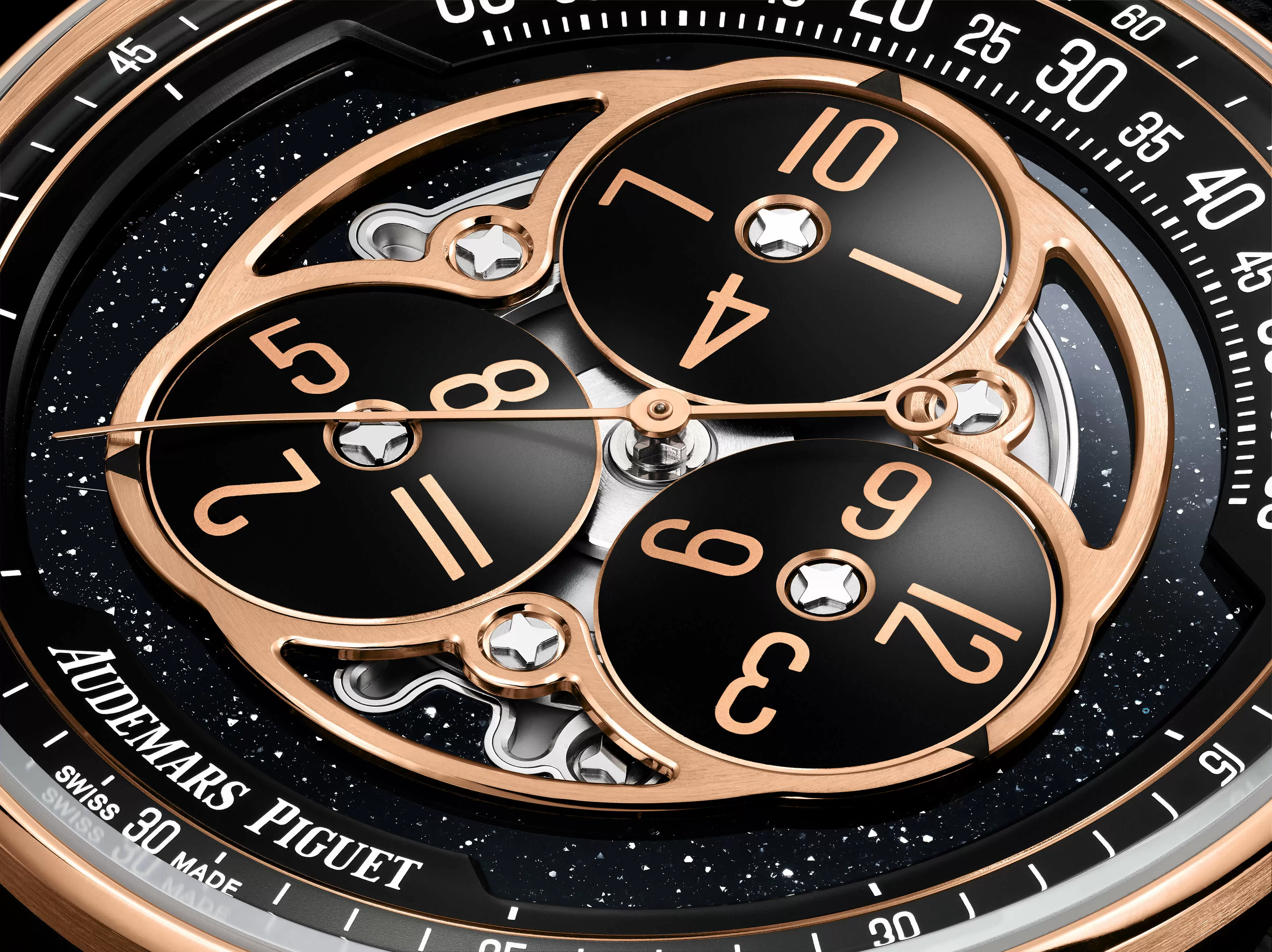 此錶用上了標誌性「雲夜藍50」「Petite Tapisserie」小型格紋錶盤,兩個計時副盤也用上同樣色調,錶圈、按把、錶冠功能選擇裝置、連接扣皆以塊狀金屬玻璃(BMG)精製而成,並因鏡面拋光處理而閃耀亮澤。底蓋經環形霧面打磨,而鈦金屬錶殼與錶帶鏈節則經霧面打磨與拋光倒角交替潤飾,營造出層次豐富的光影意趣。為慶祝品牌創立150週年,錶盤上12時位置裝飾著「Audemars Piguet」特別標誌,其靈感源自歷史兼藏設計,底蓋鐫刻著「1 of 150 pieces」與「150」紀念標誌,突顯錶款的稀有性,以及延續傳統、積極創新的品牌精神。