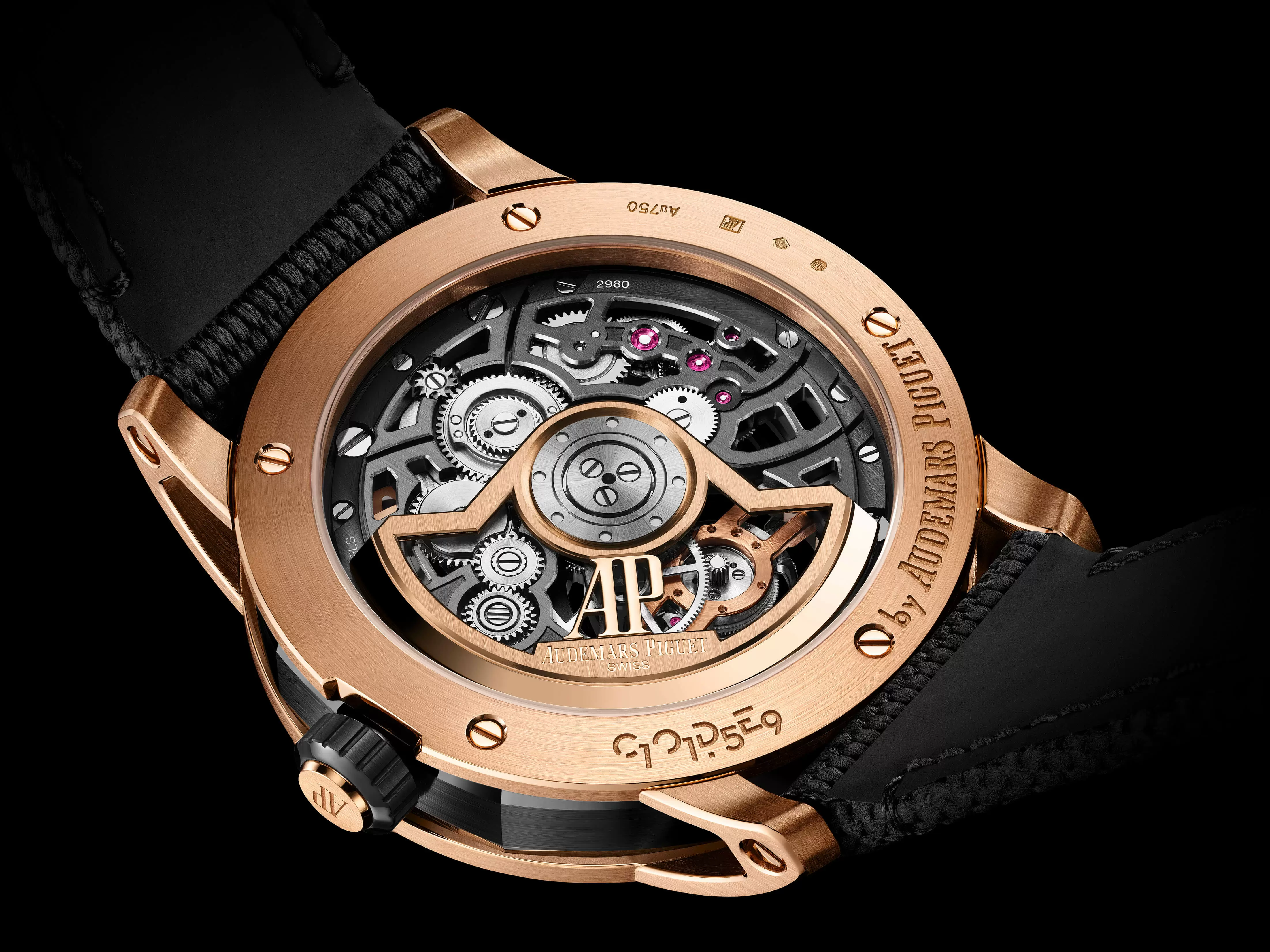 這是CODE 11.59系列首款自動飛行陀飛輪鏤空腕錶。當中搭載的是愛彼最新一代飛行陀飛輪機芯,2980自動機芯,這是2972機芯的升級版本。使其與結構複雜且曲線優美的錶殼完美融合。全新機芯優化了人體工學 設計,讓日常佩戴體驗更加舒適便利。飛行陀飛輪裝配於旋轉的框架中,框架每分鐘旋轉一圈,不僅能抵銷 地心引力對走時準確度的影響,還營造出引人入勝的動態美感。