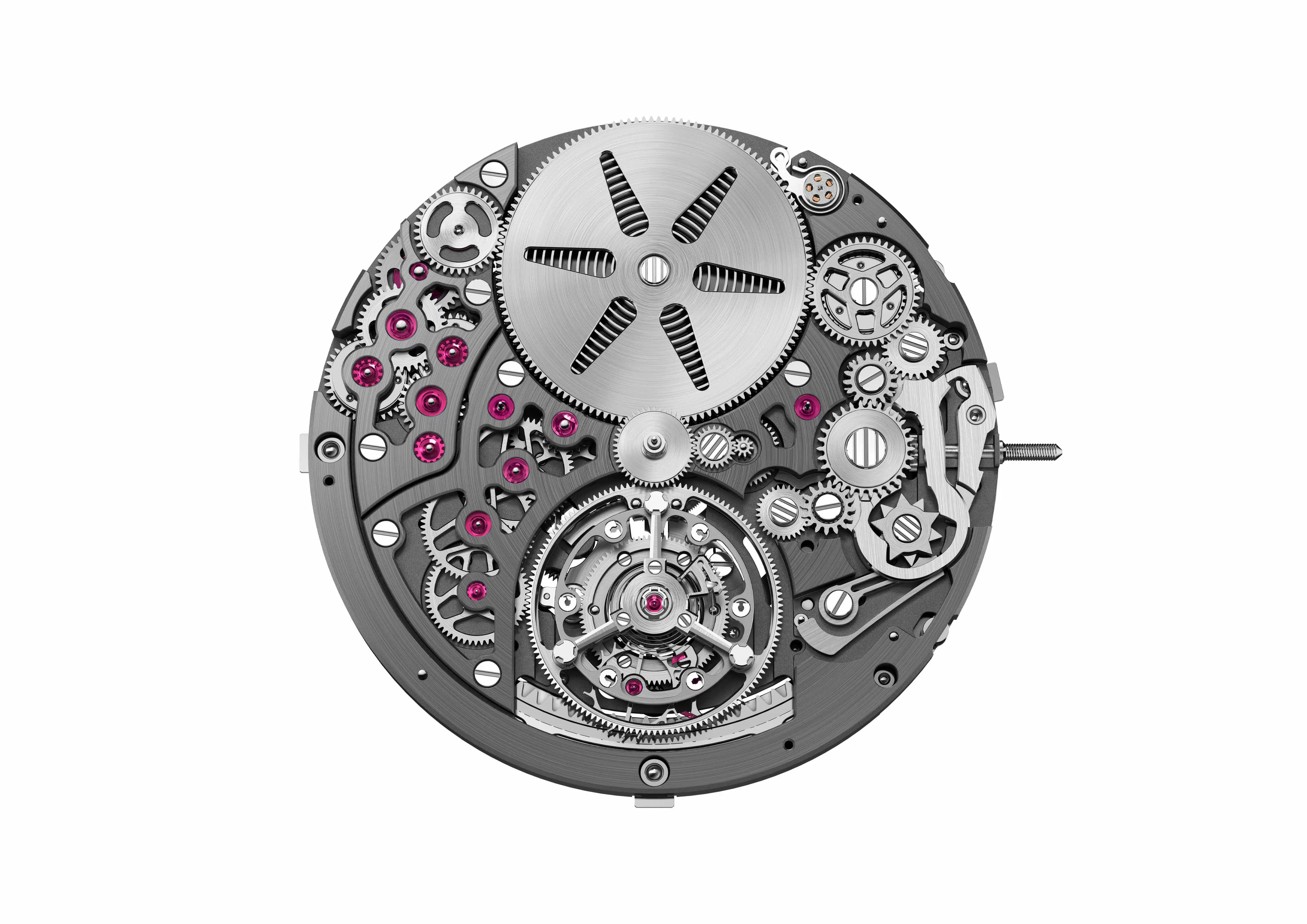 全新錶款將鏤空藝術演繹得淋漓盡致。主夾板與夾板大量鏤空,摒除所有非必要的部分,既保留了完整的結構和功能,又讓光線貫穿機芯,展現精妙之美。要做到這效果,工匠先使用 CNC 數控加工技術裁切塑形,再運用放電加工(EDM)工藝精雕細刻,以確保各個組件完美契合。接著,製錶師花25小時親手組裝機芯,締造震撼人心的多維「建築」。手工潤飾的發條橋板上點 綴著 6 個標誌性 V 形倒角。表面裝飾亦登峰造極。霧面打磨與亮面拋光交相輝映,呈現流動的光影效果。6 點鐘位置的飛行陀飛輪優雅律動,為錶盤注入深邃的動態美感。此新作以黑色陶瓷錶殼搭配玫瑰金錶耳、錶圈、 底蓋,夾板與指針也閃耀著溫暖的金色光澤,既具當代風格,又歷久彌新。