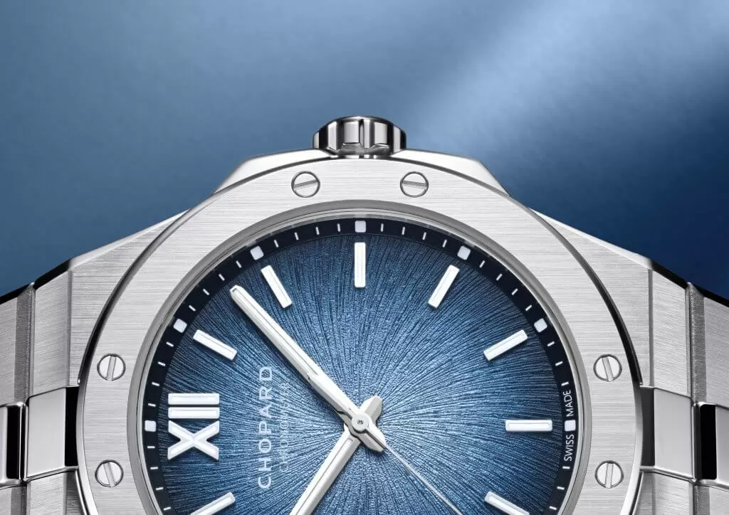 飾有令人聯想到阿爾卑斯山巍峨景致之名的彩色錶盤是Alpine Eagle系列的標誌性特徵,例如「阿萊奇藍」、「隆河藍」以及「瓦爾斯灰」。受大自然壯美景色的啟發,蕭邦推出了一款全新色調:一種漸變的藍色,並命名為「冰川藍」。這種別具一格的色調,從錶盤中心的淺藍漸變至邊緣的深邃,演繹著阿爾卑斯山冰川和湖泊的瀲灩之美,其倒影隨著光線和時間的推移而從澄澈轉為幽深。錶盤中心呈現出山間泉水的純淨無瑕,並逐漸過渡至深邃的藍色,令人聯想到陡峭而堅實的冰川。濃郁的藍色,與包裹著錶盤的鉑金的致密質感相得益彰。
