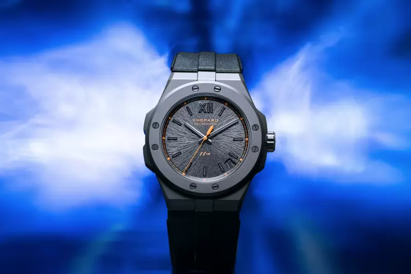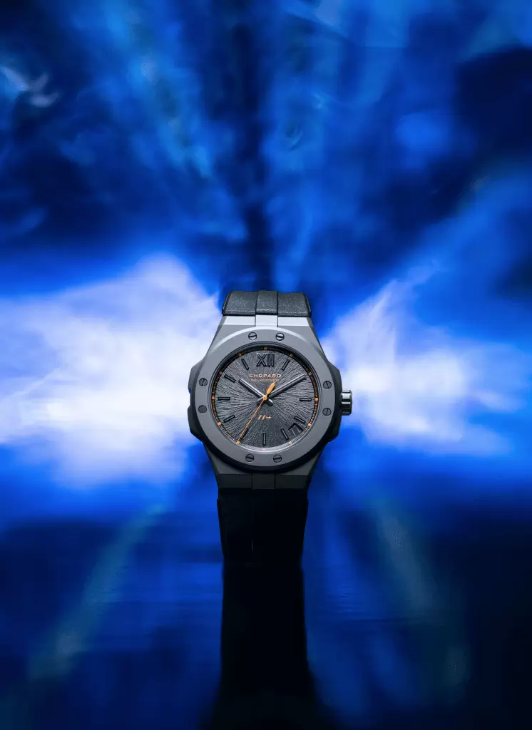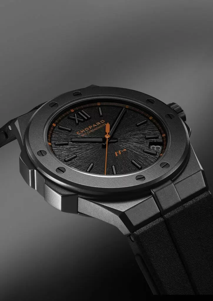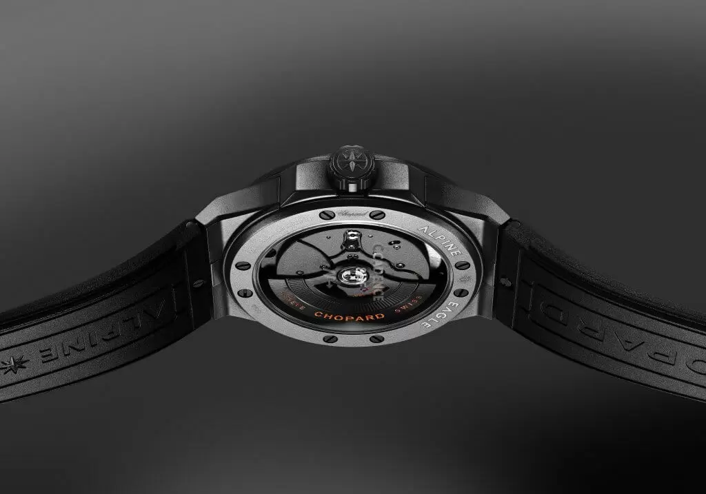 為極致減輕重量,每個細節皆精心考量。首先,直徑41毫米、厚9.75毫米的錶殼,以及飾有八顆等距螺絲的錶圈、鐫刻羅盤玫瑰圖案的錶冠,以至錶帶的錶扣,均以5級陶瓷鈦金屬鑄造。除了輕巧的優點外,陶瓷鈦金屬的應用亦彰顯蕭邦工坊的先鋒精神:這種超強韌金屬是以電漿技術將鈦金屬氧化而成,此處理技術令其硬度高達1000維氏度,抗衝擊及抗刮性能媲美陶瓷,更呈現出歷久彌新的炭灰色調。