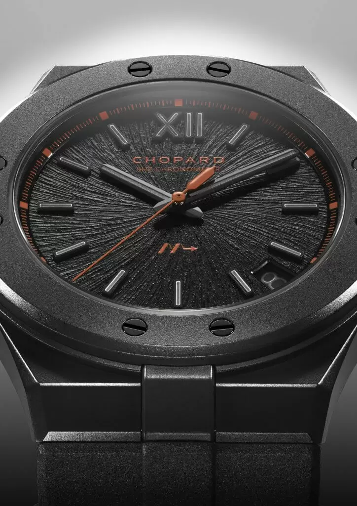 錶盤壓印著源自鷹眼的獨特圖案,直接呼應啟發此系列的威猛禽鳥的銳利目光。其純黑色調靈感源自高山峻嶺間夜幕低垂的深邃漆黑,此時,野生動物重奪主導地位。在這片深邃的夜色中,帶有鷹羽形平衡錘的橙色秒針,以及同色系的刻度圈,為整個錶盤帶來優雅而清晰易讀的鮮明對比,盡顯動感活力。錶盤下方更綴有同樣是橙色的動感箭形標誌,此乃蕭邦高振頻腕錶的專屬標記。