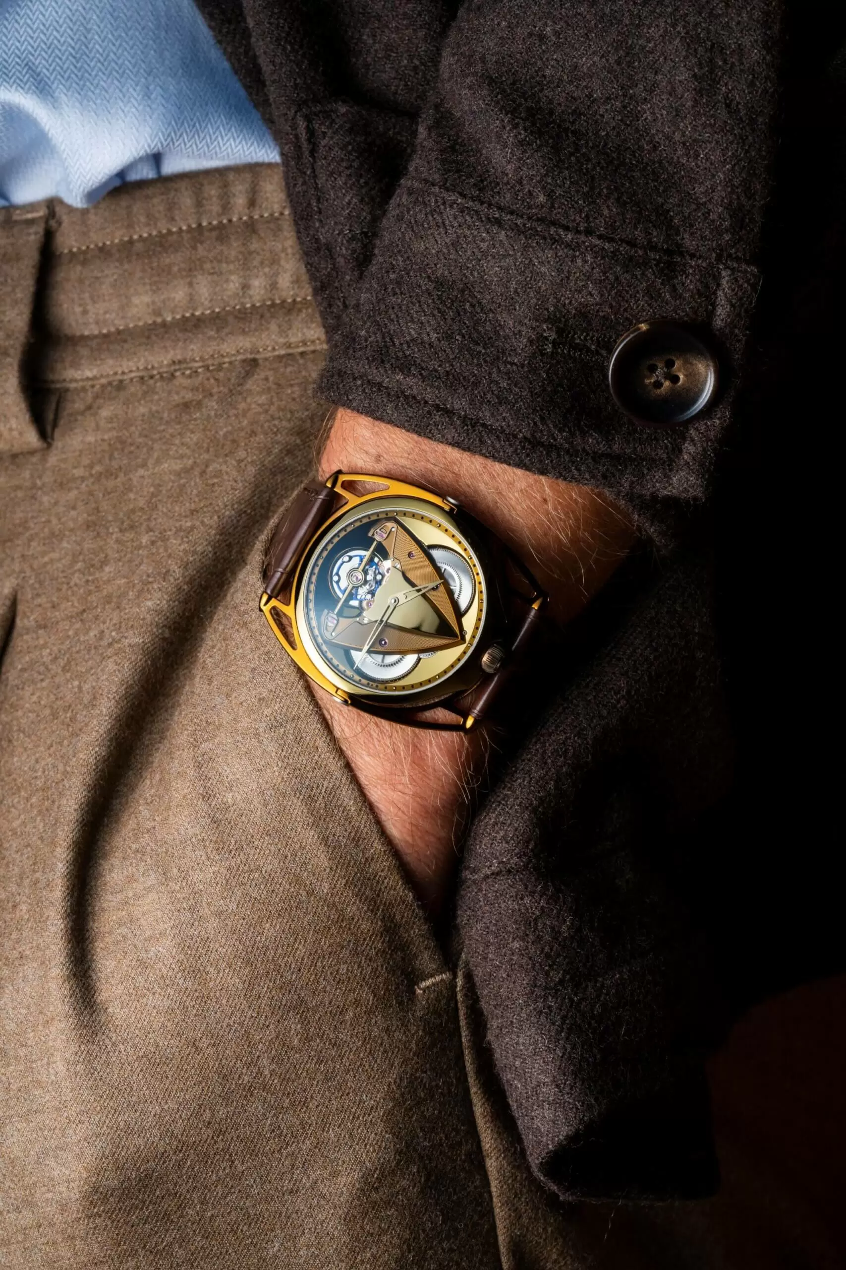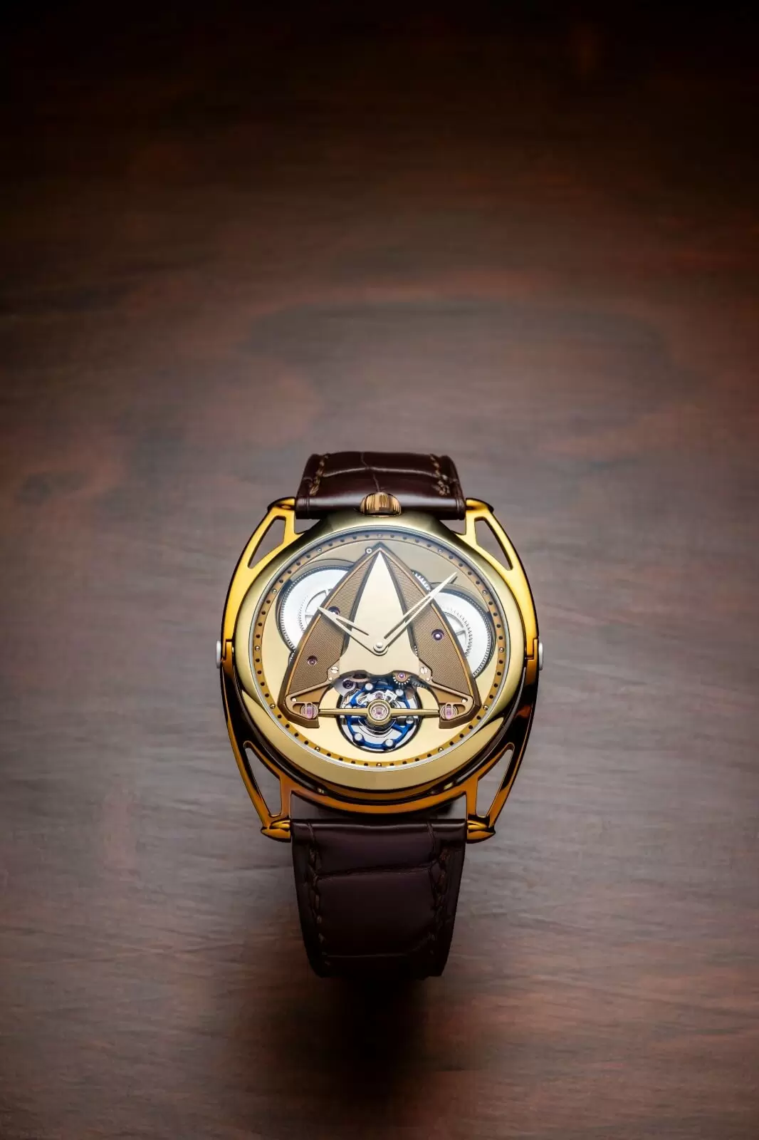整枚腕錶幾乎被黃金鈦金屬覆蓋,從環形磨砂錶盤、時標、橋板、指針到發條橋,每一處皆以鏡面拋光呈現。唯一保留其原色的,是內部搭載品牌自製手動上鍊機芯DB2115V14的雙發條盒與平衡擺輪,在黃金背景上閃爍冷調金屬光,形成極富層次的視覺張力。