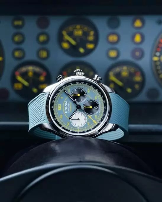 錶殼保留Belisar系列的經典結構,以316L精鋼打造,直徑達44毫米,厚度15.01毫米,強悍而不失質感。拉絲與拋光交錯的錶殼表面,加上兩側固定螺釘細節,既工業又優雅。錶鏡採用雙面防反光弧形藍寶石水晶,搭配透明底蓋可欣賞機芯運作。防水深度達100米,足以應付日常與戶外挑戰。搭載Union自家改良的UNG-27.S1自動計時機芯,基於Valjoux 7750架構而來,升級矽游絲以提升抗磁與溫度穩定性。具備65小時動力儲存,並提供中央秒針、30分鐘與12小時計時盤、小秒針及日期功能。設有停秒機制,方便精準校時。新作限量388枚,定價為3,300歐元。