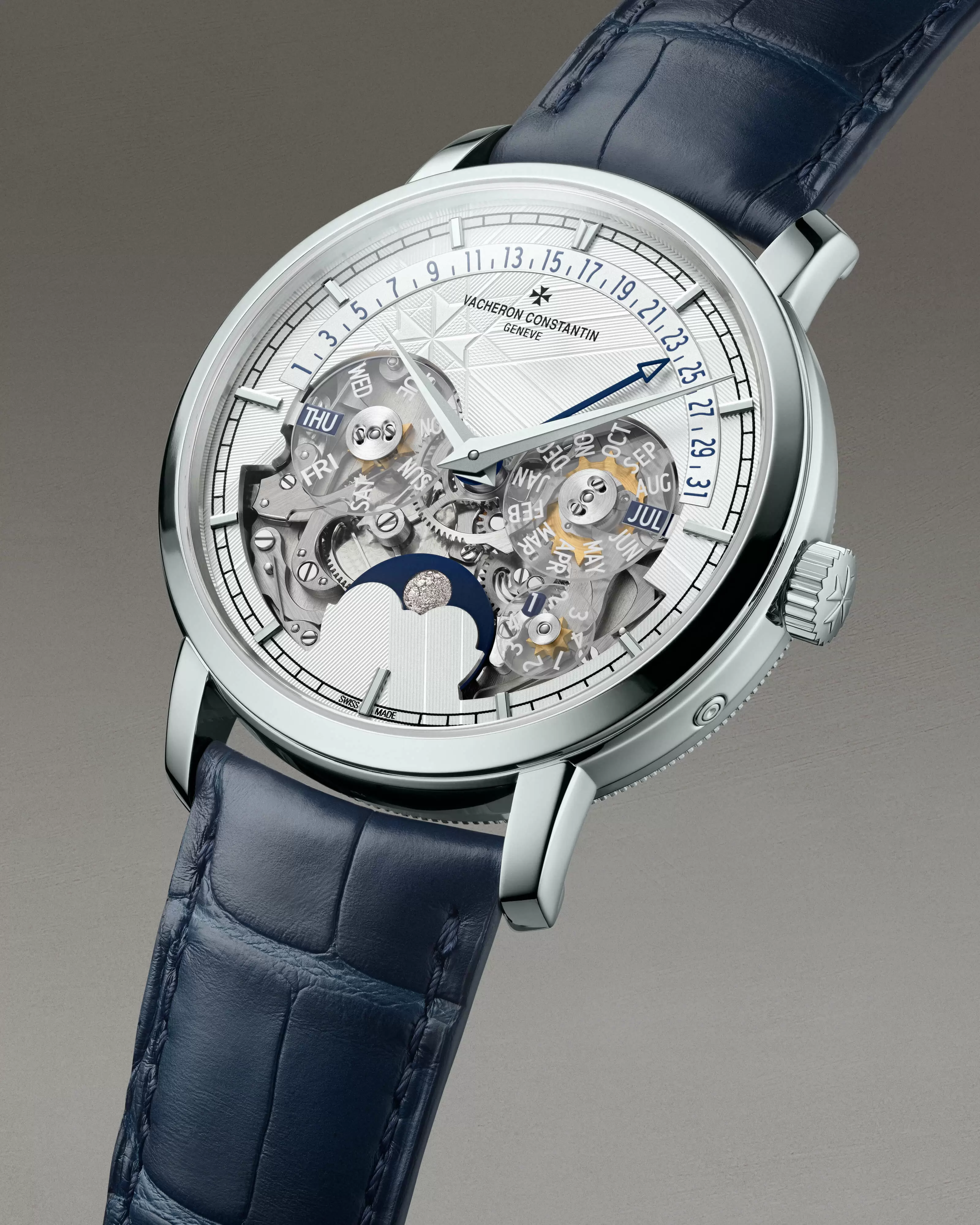 Traditionnelle全日曆鏤雕腕錶搭載品牌自家製的2460QCL/270機芯,這是2450機芯的現代版本,是首款由品牌全權自主設計及研發的全日曆自動機芯。此外,腕錶亦搭配三重日曆顯示,即星期、日期和月份,以及精密月相顯示功能,只需每122年調校一次。透過鏤雕錶盤,可欣賞一部分由312枚零件組成的自動機芯。江詩丹頓的製錶師與設計師為呈現清晰易讀的效果,特意選用藍色指針在錶盤外緣顯示日期,而星期和月份則標記在藍寶石圓盤上,與視窗的藍色背景形成鮮明對比。