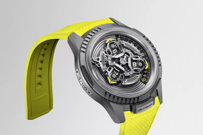 沒有錶盤,也沒有傳統的指針,藍寶石水晶鏡下是一套圍繞著矽振盪器旋轉的機械建築。三條臂架各自承載穹頂狀小時盤,在右側60分鐘刻度上滑行。小時以刻印並填上夜光的方式顯示,而底層以釕處理的金屬面板作為視覺背景,既是機芯基座,也是整個構圖的骨架。小時盤會以Urwerk招牌的「電光黃色」夜光指標指出分鐘刻度,達到類似數位與指針混合般的清晰效果,既前衛又直覺。UR-FREAK將限量生產100枚,定價為100,000瑞士法郎。