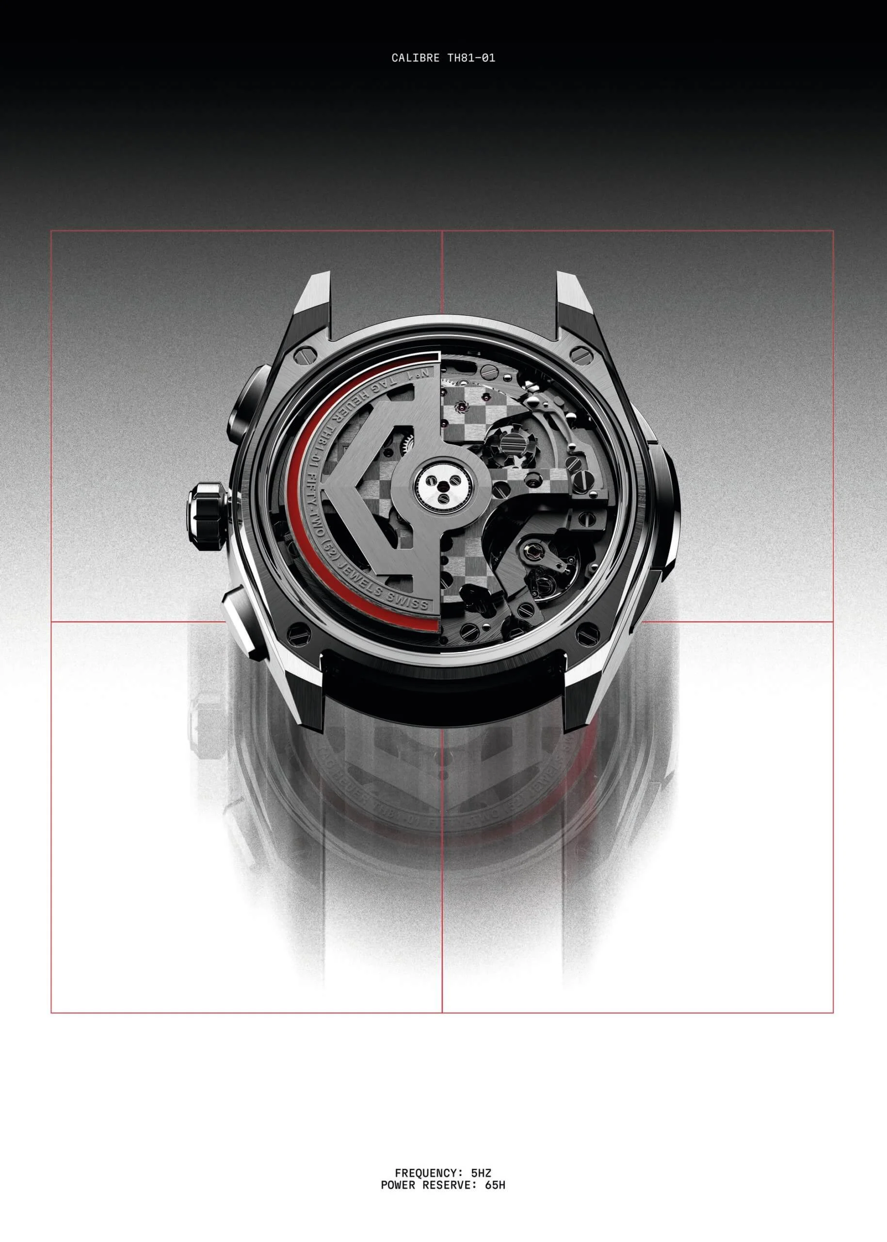 腕錶搭載全新Calibre TH81-01自動機芯,由TAG Heuer與Vaucher Manufacture Fleurier聯合研發。機芯以5赫茲高頻運行,具65小時動力儲存,由超過350枚零件手工組裝打磨而成,並飾以黑色拋光螺絲、倒角修飾與Gratté方格旗圖案。