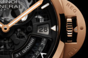 今年面世的Luminor 31 Giorni PAM01631正是向歷史致敬,由品牌「創意實驗室」以7年時間研發而成。腕錶搭載全新P.2031/S手動上鏈鏤空機芯,其4發條盒內置總長達3.3米的主發條系統。研發團隊採用串聯佈局,讓發條盒能以低扭力運作,減少摩擦。相較於其他需要工具協助上鏈的長動力機芯,佩戴者僅需旋轉錶冠128圈,即可為腕錶儲存運行1個月的能量,直接易用。機芯理論上可達36日動力,但品牌引入了正申請專利的「扭力限制系統」,巧妙地截取中間最理想的31日運作區間,避開發條輸出的高低扭力兩極階段,確保走時保持穩定。44毫米腕錶採用獨特紅潤色調Panerai Goldtech錶殼,專利偏光日期盤融入鏤空架構,限量生產200枚。