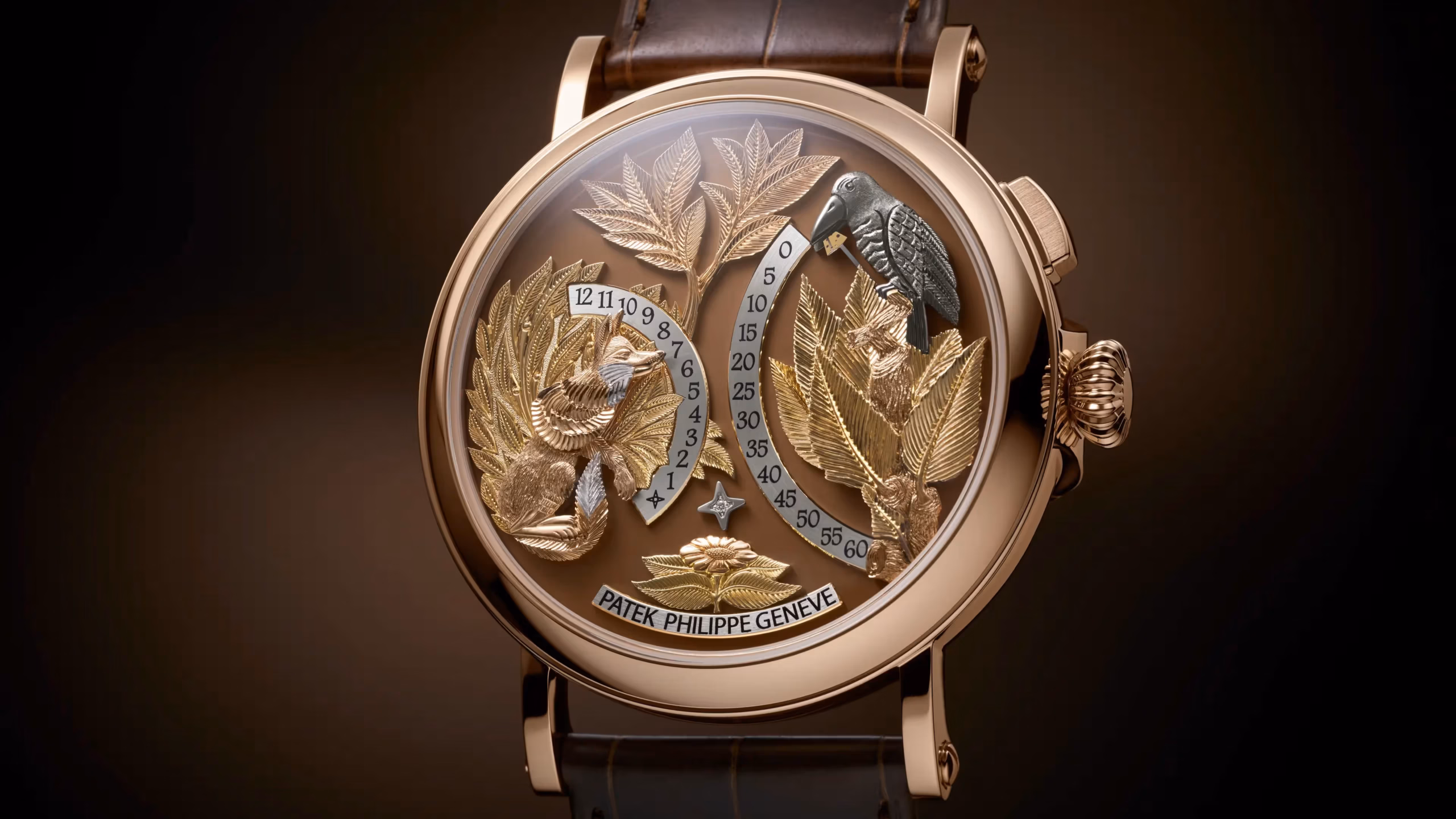 Ref. 5249R-001 「The Fox and the Crow」取材自寓言「狐狸與烏鴉」的自動人偶腕錶,玫瑰金錶殼直徑為43mm ,錶盤以 18K 金手工雕刻的部件組成,盡顯精湛工藝。啟動自動人偶裝置後,狐狸指示小時、烏鴉掉芝士顯示分鐘,極具戲劇張力。