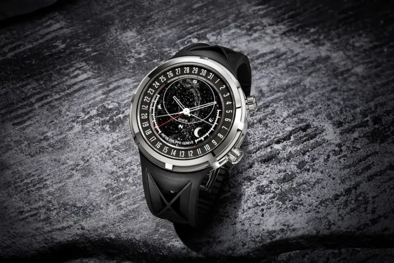 Ref. 6105G Celestial 天文腕錶,這款 47mm 無耳錶殼 Grand Complication 腕錶,配黑色複合材質錶帶,多層次錶盤顯示日內瓦上空星空、月相及月球軌道,而最大亮點是可顯示日出/日落時間並自動調整夏/冬令時間。