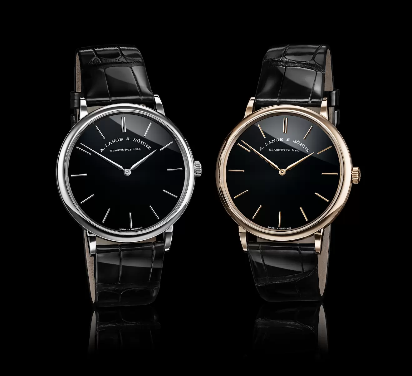 此次品牌為SAXONIA THIN帶來兩種獨特版本,分別是溫潤奢華的750蜂蜜金,與冷冽高雅的鉑金950。亮黑縞瑪瑙錶盤為設計核心,這種極少用於製錶的寶石,呈現深邃光澤。蜂蜜金與黑色錶盤相互映襯,散發暖意;而鉑金版本則以冷色調突顯出刻度與指針,形成鮮明對比。兩者皆限量200枚,展現截然不同的個性之美。