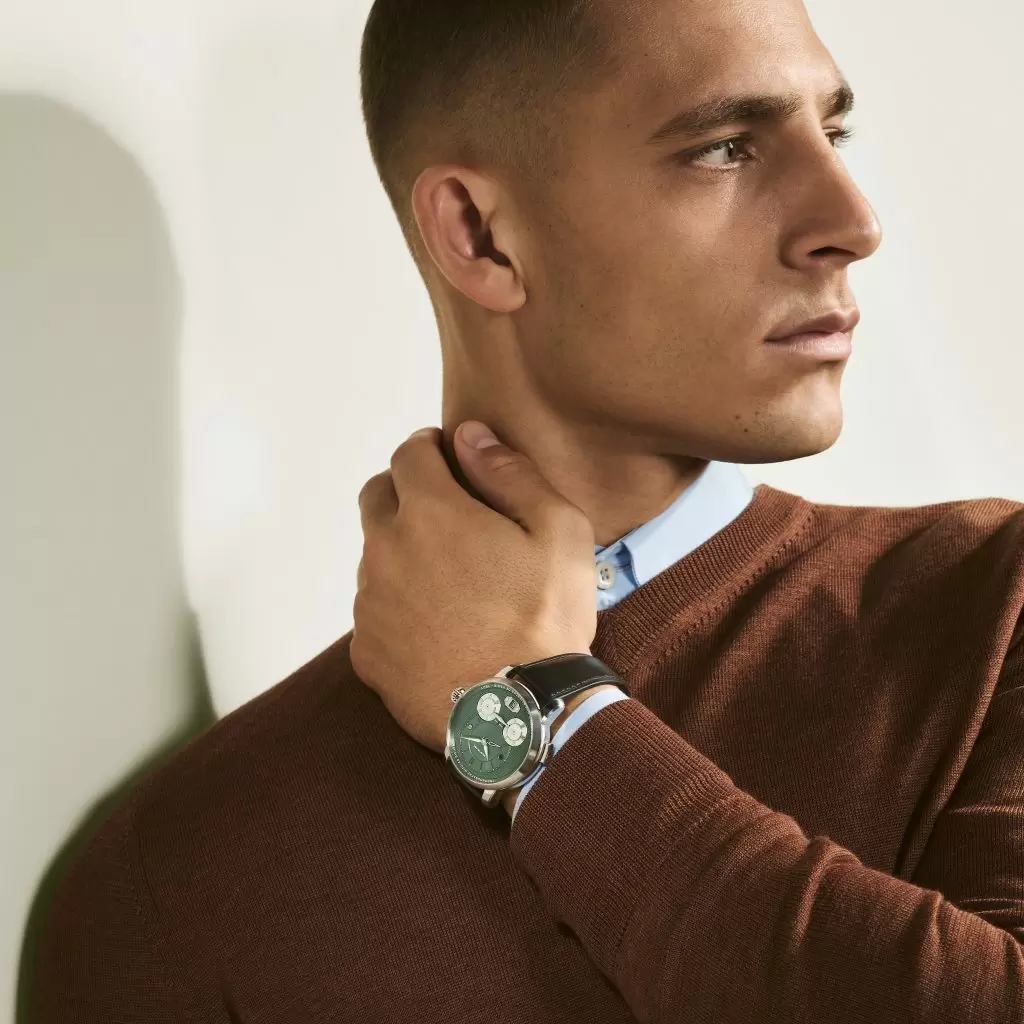 再看回錶盤上的「Clous de Paris」巴黎釘紋,既呼應城市鵝卵石街道的幾何圖形,更是頂級製錶工藝的象徵。綠色錶盤上配備銀色計時盤、夜光太子妃式指針與鏤空第二時區指針,細節層次豐富而平衡。透過透明底蓋,可以鑑賞搭載品牌首款自製單按把計時機芯MB R200,以及配備導柱輪與垂直離合機構,確保計時啟動流暢無跳動。不能忽略鏤空擺輪橋板結構同樣飾以巴黎釘紋,可說兼具抗震與美學效果,定價NT$280,300。