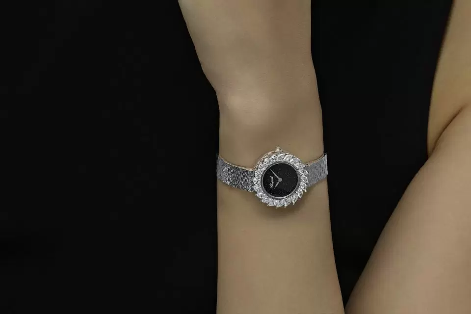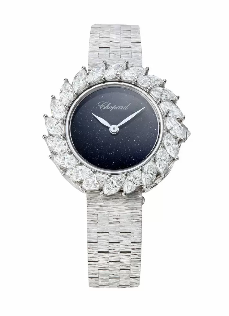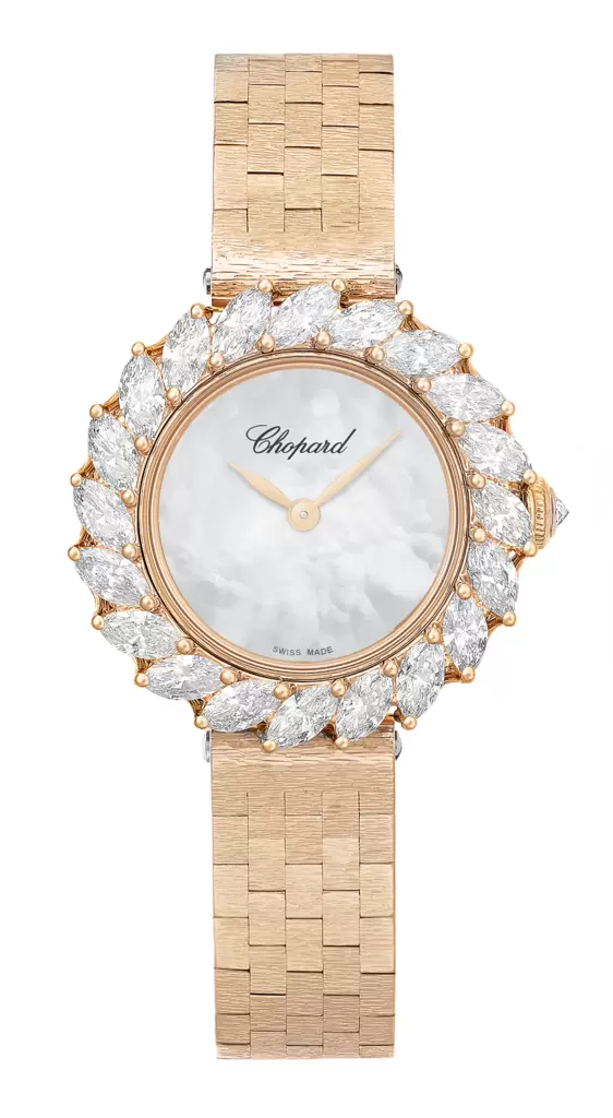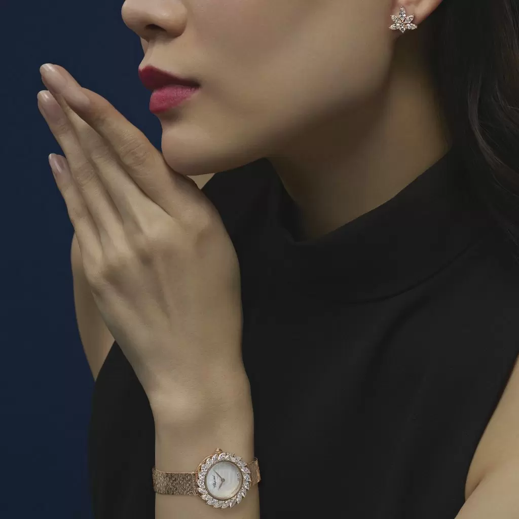 為了讓女士們佩戴得更舒適,腕錶特別用上樹皮紋金質錶鏈,以呈現絲絨般的柔軟觸感之餘,更可以隨手腕擺動流暢舞動,將珠寶與製錶完美融合。錶背之下,藏著蕭邦自製的10.01-C手動上鏈機械機芯,厚度僅2.9毫米,屬全球最纖薄機芯之一,卻仍擁有45小時動力儲備,象徵女士們的纖巧身形。玫瑰金搭配珍珠母貝錶盤,定價NT$2,230,000;18K白金搭配砂金石玻璃錶盤,定價NT$2,240,000。