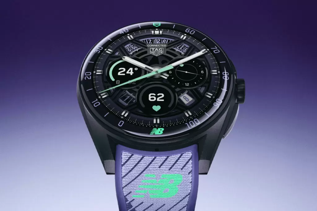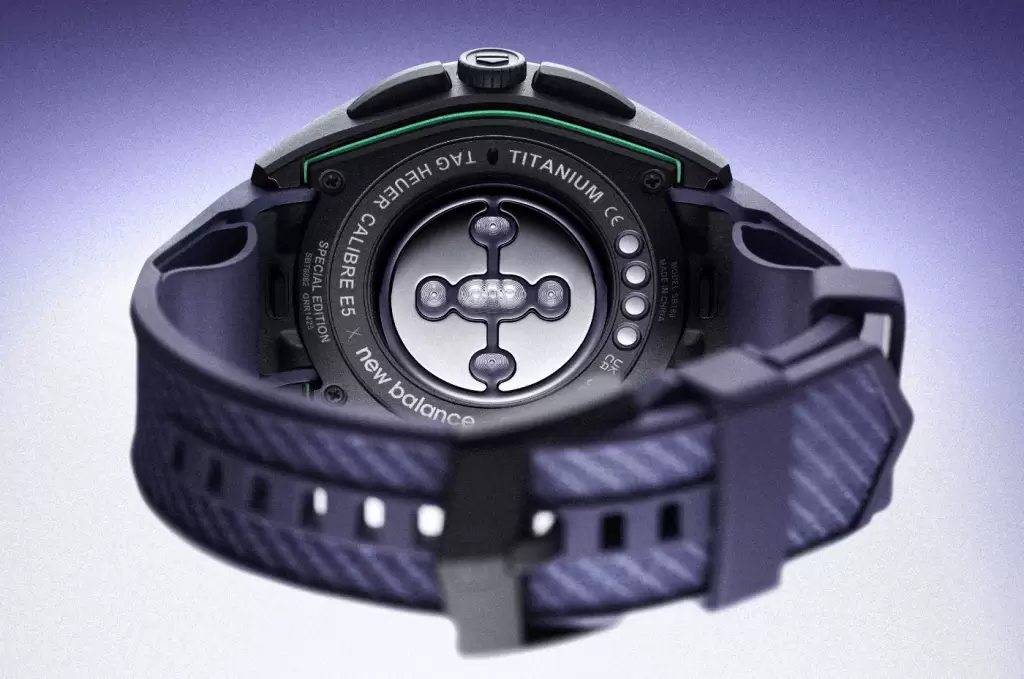 腕錶承襲TAG HEUER的工藝,以輕盈的二級鈦金屬錶殼配上黑色DLC鍍層,結構強韌而外形大膽。錶帶設計靈感源自NEW BALANCE Energy Arc科技,兼具靈活與支撐。色調以深紫、午夜藍與螢光綠為主軸,與聯乘跑鞋呼應,從腕間到足下形成一種流動的設計語言,力量與優雅並存。