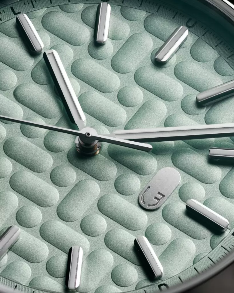 雖然這一次的2340,共有三款錶盤可供選擇,但是薄荷綠面盤型號絕對叫人眼前一亮!因為Louis Erard在亮漆錶盤上,加入膠囊造型的壓紋,凹凸分明的形狀,反射出平衡的光影,比一般的錶盤生動得多,充分表現個人風格。另外的岩灰藍與深藍款則以水平線條壓紋映襯鍊帶節奏,適合喜歡傳統與簡約的用家,三款新錶同樣採用懸浮立體時標與霧面拋光雙處理指針強化可讀性,內外兼備。