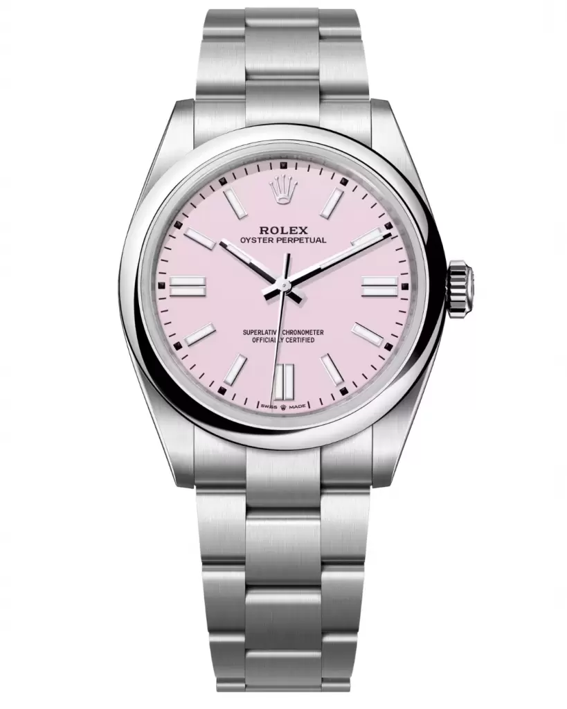 再細看這一次的糖果粉紅色和薰衣草紫色OP 41mm,型號為今年新推出的134300,對比舊型號124300,錶耳方面修長了一點,看上去不會有臃腫的感覺,而錶冠卻加大了,讓操作更為便利。即使OP只是入門系列,勞力士的製作也絕不馬虎,其錶面底部的黃銅板共噴上了六層噴漆,以形成均勻齊整的表面。最後才塗上油光漆進行拋光,來呈現其光澤和色調,加上以手工鑲嵌的鐘點標記及皇冠,讓整枚腕錶散發瑞士製錶的頂級工藝,定價NTD 230,500。