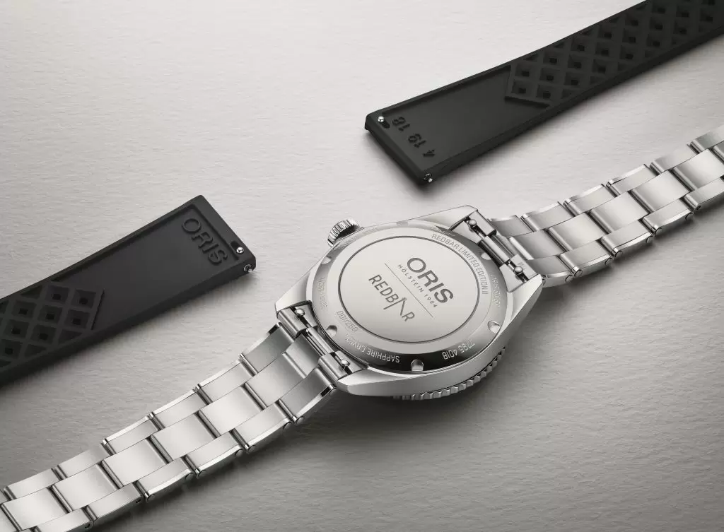 當然,作為聯名腕錶,外觀也是十分重要,獨特的紅黑漸層錶盤以Super-LumiNova螢光塗層強化夜光辨識度,最特別是在底蓋鐫刻了「Oris x RedBar」字樣,以細節呼應合作精神。39毫米不鏽鋼錶殼配備單向旋轉陶瓷上圈,實用而具氣派,防水深度達200米,不算頂級規格,卻足以應付日常潛水需求。再加上隨附黑色橡膠錶帶與金屬鍊帶,方便自由轉換風格。全球限量250只,相當罕有,售價NT$91,800。