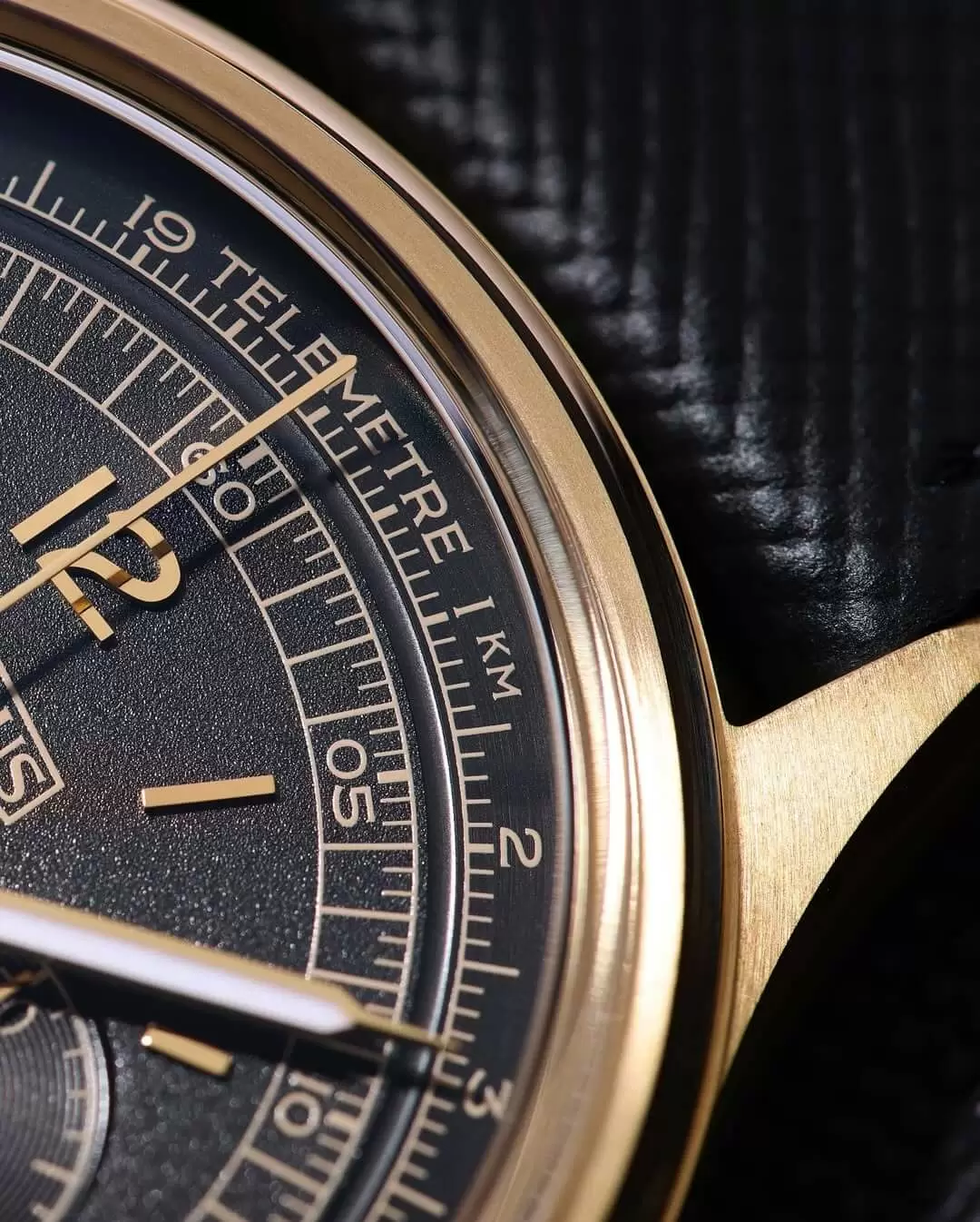 錶盤選用罕見的黑色弧面設計,這一配色對ANGELUS而言極少見,卻正是Massena LAB的標誌美學。磨砂中心區減少反光,外圈以緞面拉絲處理,刻有20公里測距刻度;菱形切割的層級結構將測距環與軌道式分鐘刻度分隔,立體感明顯。九點鐘位置設小秒盤,三點鐘位置為三十分鐘累計盤,兩者均以蝸紋打磨,細節極致。阿拉伯數字與棒狀時標以黃金製成,搭配覆有 Super-LumiNova 夜光塗層的柳葉指針,既典雅又實用。
