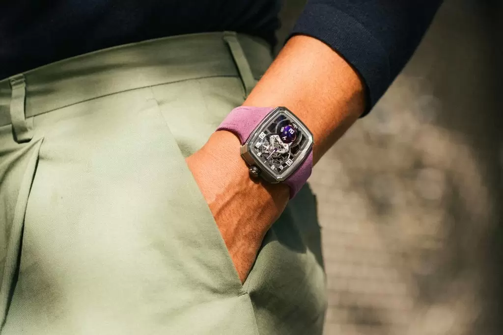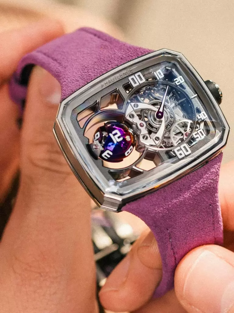 再細看錶盤右側的逆跳分針,在扇形軌跡上緩緩前進,到達終點後隨即彈回原位,象徵時間的呼吸。錶盤下方搭載全新研發的A82手動上鍊機芯,一方面是專為小錶殼而特別設計,同時又擁有72小時動力儲存。由錶背觀察可見到鏤空發條盒,除顯現其發條張力,更具備防止因逆向時間設置等錯誤操作的安全機制,十分貼心。搭配紫色絨面皮革錶帶與鈦金屬折疊扣,形成統一的風格,盡見工藝細節。Sphere Series 3限量僅28枚,售價NTD2,920,000。