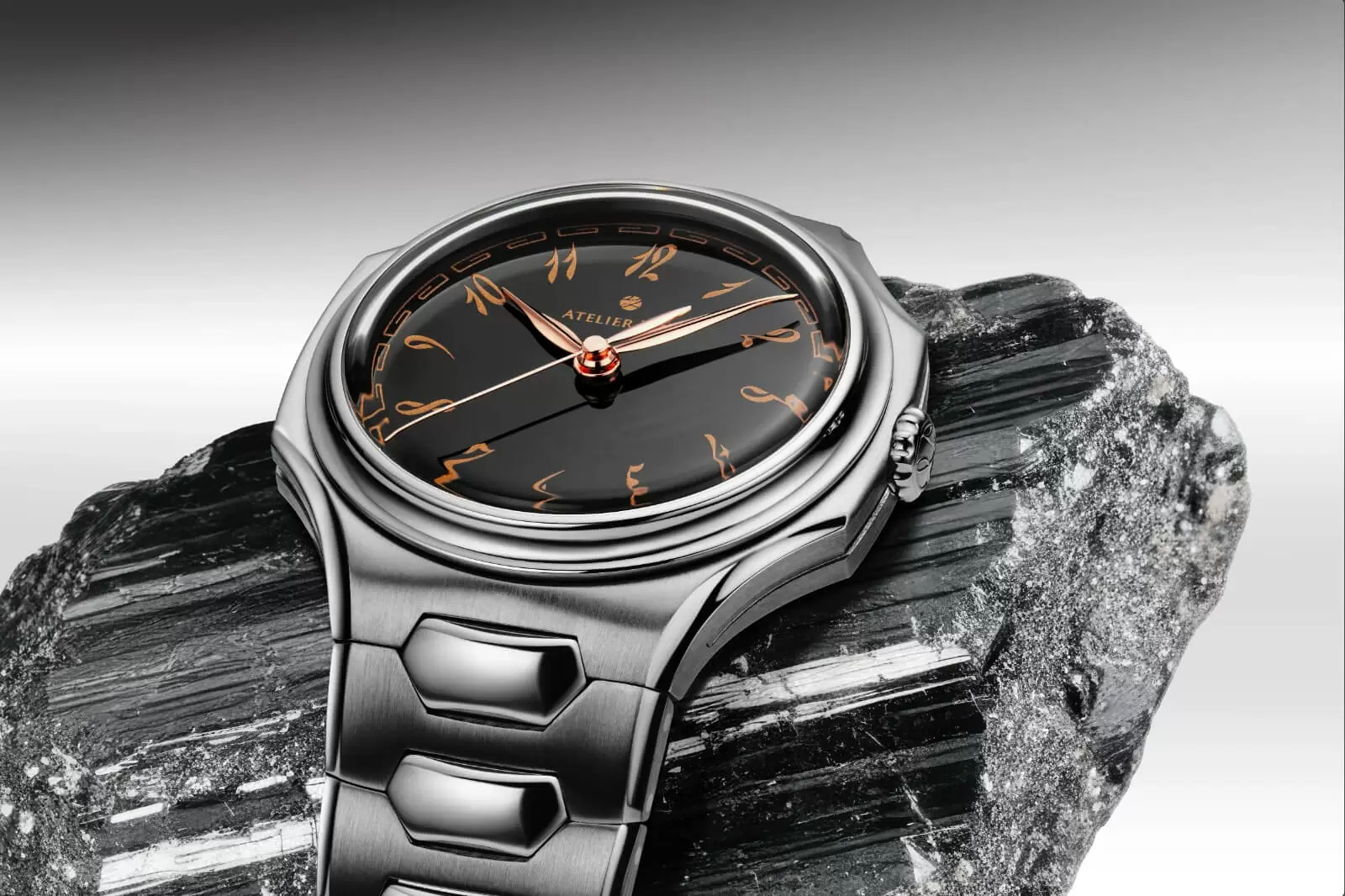 多年來,只有極少數品牌曾以鉭作為素材試驗,但真正採用全鉭金屬錶殼與錶帶設計,並進入常規生產的品牌,ATELIER WEN成為了第一個。Inflection的誕生始於2022 年,品牌歷經多次打樣與材質測試,只為讓這種難以駕馭的金屬,在光影下展現柔和與力量並存的美感。整體錶殼直徑40毫米,線條簡潔卻層次分明,凹凸交錯的錶殼與錶帶經過手工拉絲與拋光,讓鉭的厚重更添光澤。佩戴在手腕上時,那份重量感成為了一種隱喻,提醒大家腕錶不僅承載時間,也承載工匠的堅持與物質的深度。