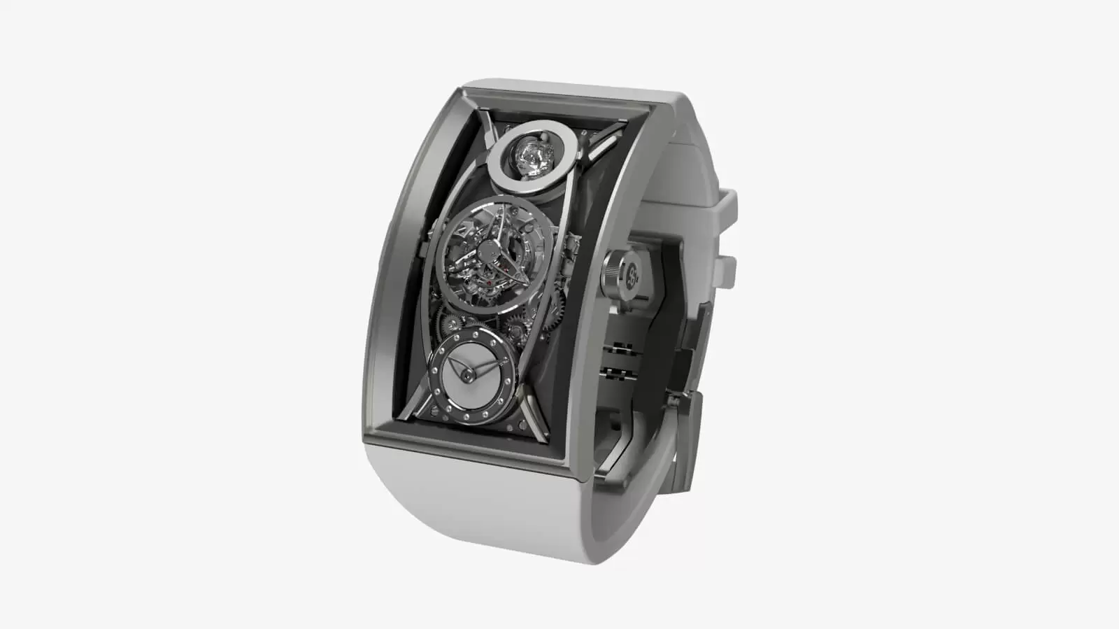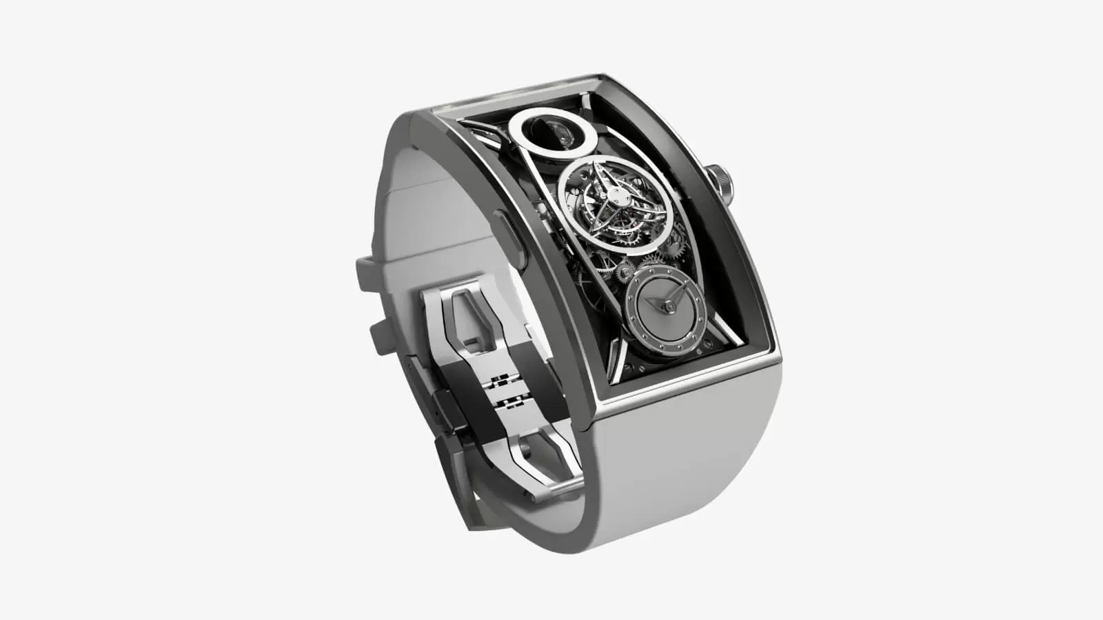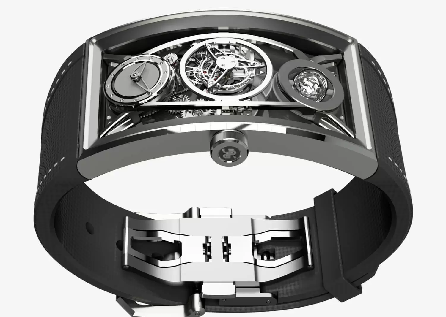 每一個零件、每一個打磨面都同時具備功能與詩意。從手工雕飾的橋板,到以高科技聚合物晶體鑄成的透明結構。腕錶可自由轉換錶帶系統,於手工雕飾金屬鏈帶與多款皮革之間切換,體現佩戴者的個人節奏。腕錶上方的月亮以一顆6毫米的實驗室培育鑽石打造,能隨盈虧而開闔,如真實夜空中的月影。其位置與佩戴者所在地的天空精確對應;中央飛行陀飛輪象徵人類對時間的征服與敬畏。其結構靈感源自電子環繞原子的軌道與原子能的國際符號,將自然的對稱與數學的嚴謹融為運動之詩;最終的時間顯示設於內腕,只為佩戴者而設。