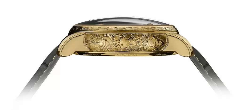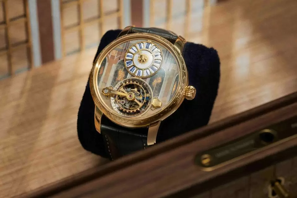 另外,指針中央飾有阿波羅太陽神的立體頭像,並經3D掃描與雷射雕刻復刻凡爾賽宮大理石庭院的神話時鐘。再看看陀飛輪部份,是結合品牌專利的「Exo」外置陀飛輪結構,將擺輪懸於框架之外,令精準度與穩定性兼具。只要透過透明底蓋,便可見到日內瓦波紋與鏡面拋光的機芯細節。最後,每只腕錶皆配備由巴黎木藝品牌Elie Bleu打造的音樂錶盒,內置瑞士Reuge音樂機芯,播放伏爾泰作詞、拉莫譜曲的舞會樂章。當旋律響起,腕錶在微縮鏡廳木地板上緩緩旋轉,將凡爾賽的金色夢境再次呈現。