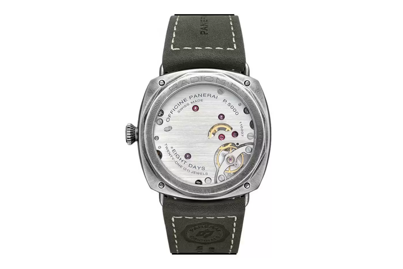 實心底蓋延續Radiomir系列的簡約輪廓,強化整體結構與防護性,呼應品牌一貫的實用主義美學。在簡潔的背面下,是對時間精準與堅韌的執著。搭配一條棕色皮革錶帶,飾以對比白色縫線,並配備不鏽鋼針扣。柔和的皮革色調與錶殼的古銅光澤、米色夜光形成完美平衡,呈現溫暖而內斂的氣質。這份細節上的克制,使腕錶隨時間變得更具魅力。