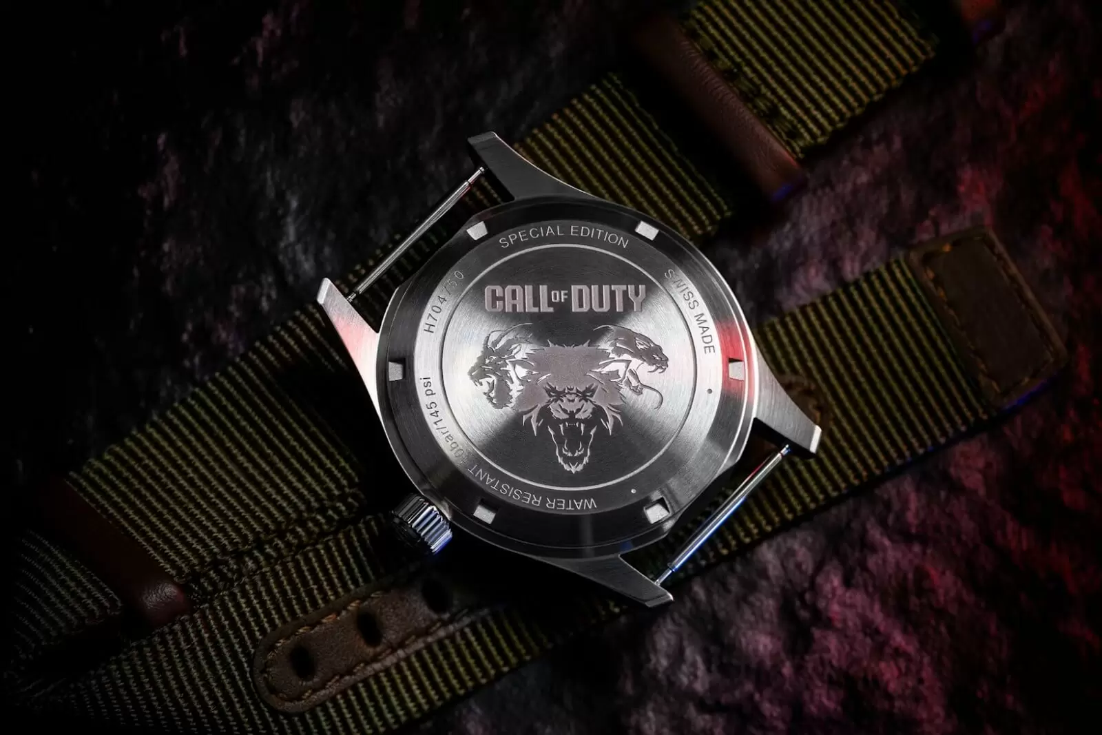 與多數聯名設計不同,這枚腕錶外觀幾乎未改動。黑色錶盤、綠色NATO錶帶、鋼製錶殼,一切保持Khaki Field的簡潔與實用本色。唯一透露其特殊身份的,是錶背刻有《Call of Duty: Black Ops 7》的標誌,以及隨附的戰術風格包裝盒。