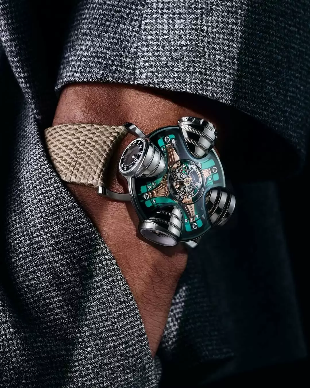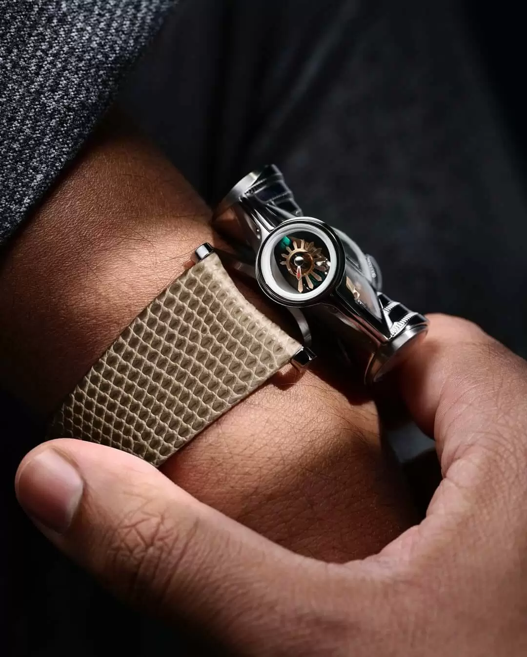 MB&F向來擅長把機械語言推向藝術層面,HM11本是品牌最大膽的結構實驗之一,在Art Deco版本中換上截然不同的視覺語彙,垂直線條、階梯式結構與日光放射圖騰,讓這座腕上機械在未改動任何機械核心的前提下,煥發出濃厚而迷人的三十年代風格。