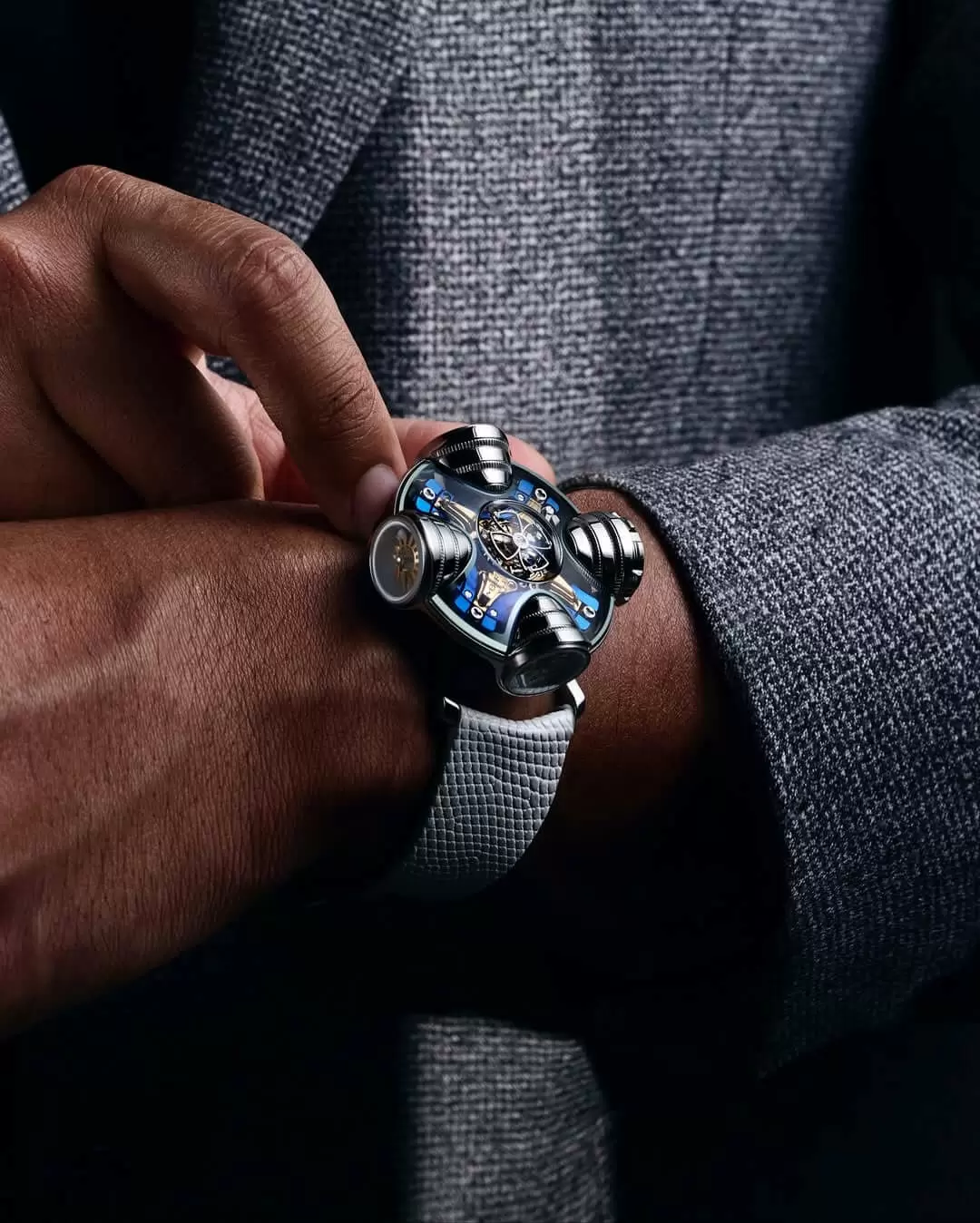 MB&F的Horological Machine系列是跨越工藝、建築與雕塑的結晶,2025年這座「腕上建築物」以全新的Art Deco版本再度進化,將三十年代的幾何語言注入其中,形成另一種截然不同的美學。新作HM11 Art Deco延續基本結構,直徑42mm的Grade 5鈦金屬錶殼、由雙層藍寶石水晶罩起的中央天井、四個向外延伸的功能模組,以及具備旋轉上鍊功能的錶殼。每次順時針轉動45°,便能為發條盒注入72分鐘動力,這種極具儀式感的操作方式,已成為HM11的標誌性體驗。