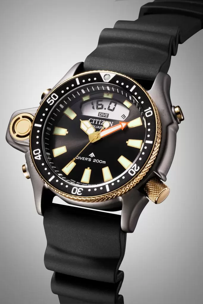 除了外形特別,作為Series 8的重點功能款,NB6035-55H在性能上同樣展現CITIZEN的現代技術。內藏的9054機芯搭載GMT兩地時間功能,使用家可以在不同時區之間快速切換,是外派或跨國旅遊的好夥伴。特別是加入JIS 2型抗磁,更是重要升級。面對隨身的筆電、手機甚至包款磁扣等磁場干擾,依舊能保持穩定走時。另外,還有台灣限量10只的Aqualand JP2008-06E腕錶,既保留大型深度感測器與橙色分針,再以黑金配色和數位顯示重新詮釋,是品牌向專業潛水的致敬之作,售價NT$22,800。