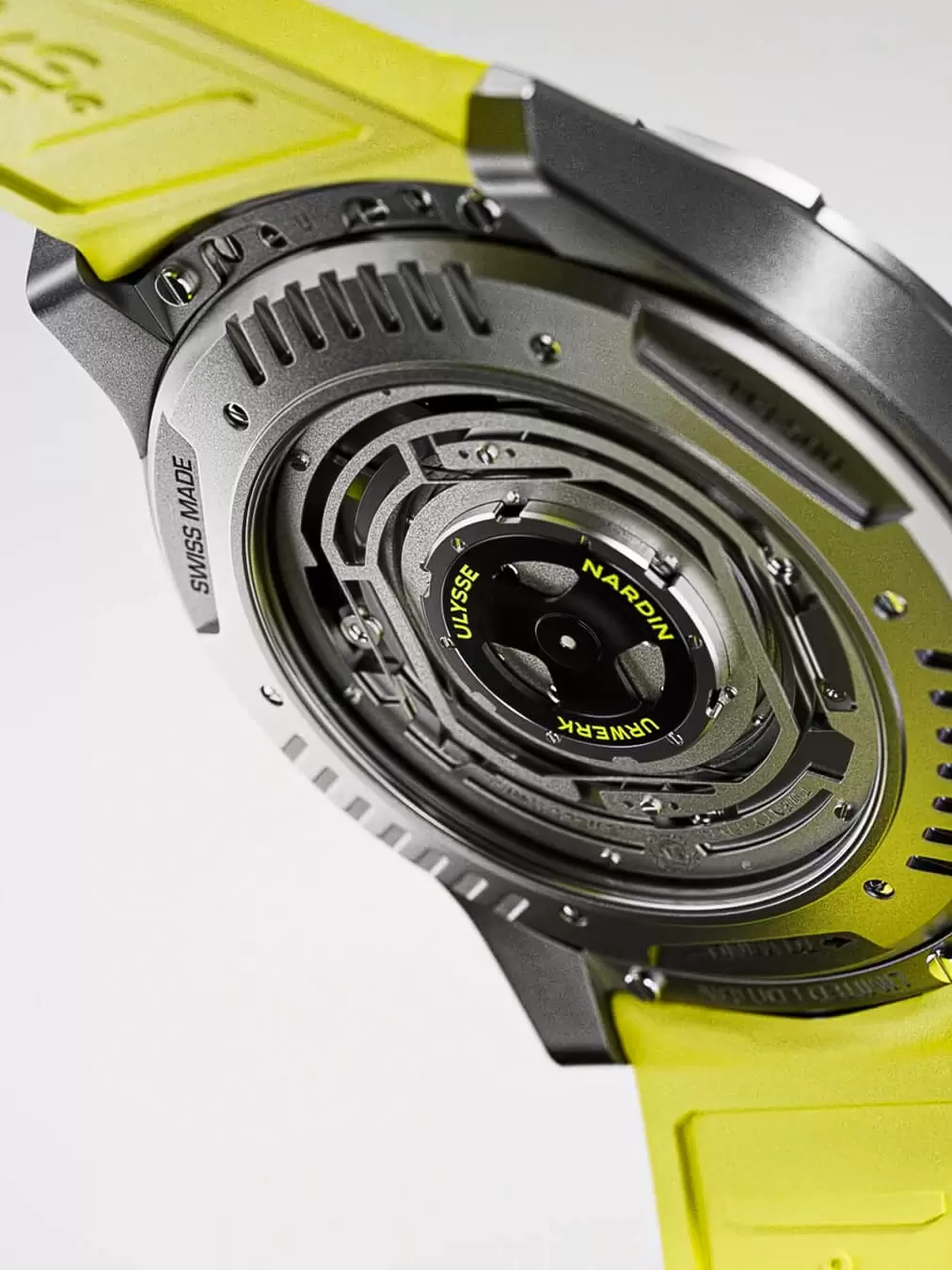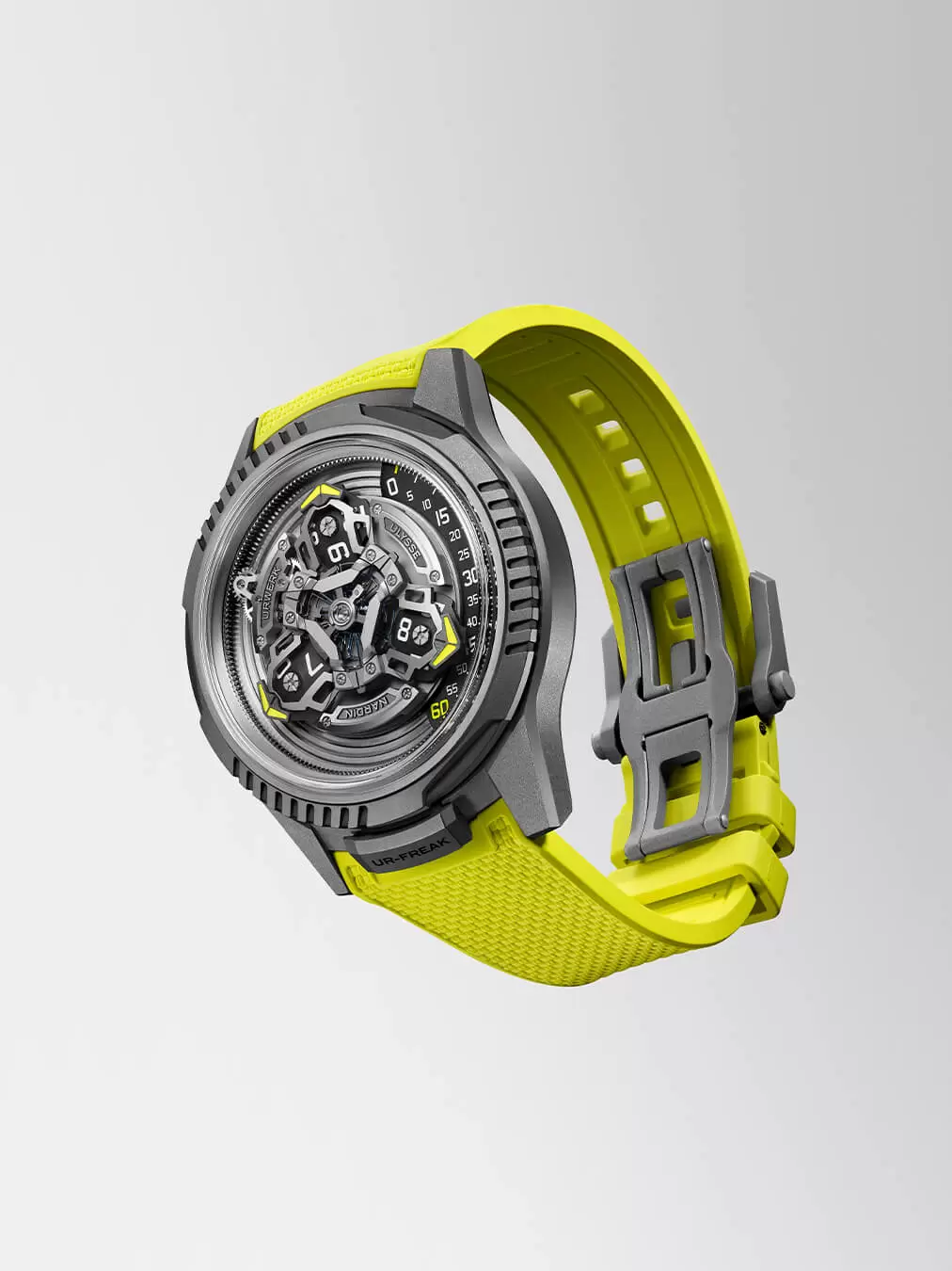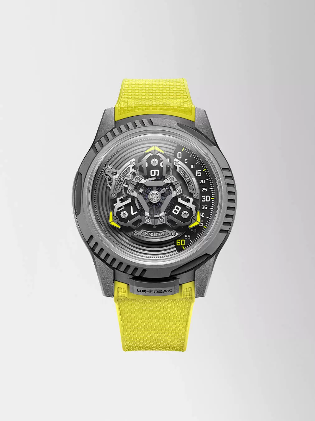 沒有錶盤,也沒有傳統的指針,藍寶石水晶鏡下是一套圍繞著矽振盪器旋轉的機械建築。三條臂架各自承載穹頂狀小時盤,在右側60分鐘刻度上滑行。小時以刻印並填上夜光的方式顯示,而底層以釕處理的金屬面板作為視覺背景,既是機芯基座,也是整個構圖的骨架。小時盤會以Urwerk招牌的「電光黃色」夜光指標指出分鐘刻度,達到類似數位與指針混合般的清晰效果,既前衛又直覺。UR-FREAK將限量生產100枚,定價為100,000瑞士法郎。