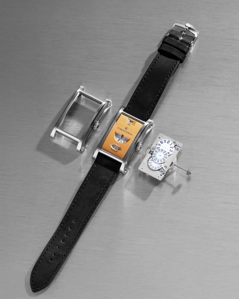 這一次的Neo Digiteur把精煉的不鏽鋼長方圓形錶殼重新描摹原始輪廓,錶側的水平噴砂帶來低調卻鮮明的光影層次。再看看經典的洋蔥型錶冠也被雕塑成俐落的平面造型,進一步強化未來感。而真正讓Neo Digiteur與眾不同的,是腕錶以三個視窗構成純機械的時間介面,12點鐘的瞬跳小時以俐落節奏開闔,中央則呈現線性流動的分鐘顯示,6點鐘的水平秒盤則像是時間的底層脈動,乍看像電子顯示,但背後全部是齒輪、彈簧與跳時模組協作的成果,宛如把數位UI用機械語言重新寫了一遍。
