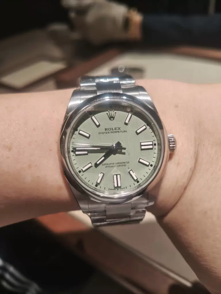 還記得當時的銷售人員十分親切,在瞭解到我是想來看今年才推出的Oyster Perpetual薰衣草紫色和開心果綠色的型號後,他們便安排我到ROLEX綠色的天鵝絨與皮革座椅上等候,期間也預備了礦泉水放到大理石的桌子上,其他的佈置還用上胡桃木、青銅與黃銅材質。之後,他們也詳細解釋了兩枚不同尺寸和顏色的OP資料讓我參考。當然大家也知道這兩支熱賣的新型號,沒可能可以立馬買到,但是銷售人員也認真地為我登記購買資料,並收到短訊確認,讓人感受到親切和專業的賞錶體驗。