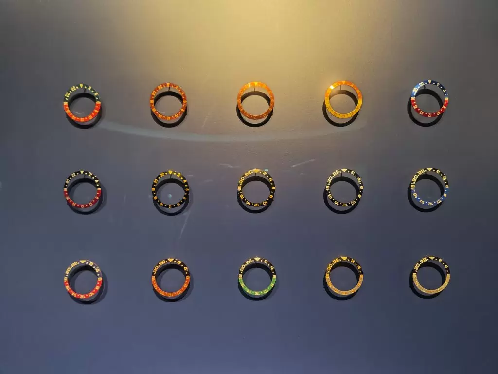 之後,就可以沿著時間軸前進,回顧整個腕錶系列的技術演進與設計轉折,除了可以看到型號6542的首款GMT-Master,以至1675、16760等經典型號。值得留意是各款GMT外圈展示,由早期的鋁片圈到後期的陶瓷圈以至各種顏色,讓你重溫年代變遷。繼續走下去,就會看到一枚由瑞士運來的大型GMT-Master腕錶,比掛牆鐘還要大,也是合照打卡的好位置。如有興趣的話,還有迷你影院,可以供參觀者欣賞關於此腕錶系列的簡短紀錄片。最後則有互動屏幕,跟你總結這個參觀歷程。