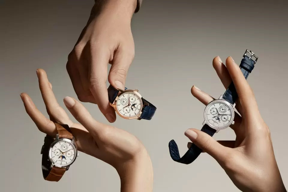 在設計上,這次的新作是向1983年經典的43031型號致敬。當年正值石英危機,而這只萬年曆腕錶,成功讓機械製錶重新被世界看見。如今,乳光銀色錶盤、對稱配置的三枚小錶盤,以及6點鐘位置的月相視窗構成的視覺平衡,經典卻不顯老態。粉紅金款以同材質指針與時標呼應錶殼,搭配深藍月相與鱷魚皮錶帶;白金款則以粉紅金指針點亮冷色調錶殼,淺藍月相與淺棕錶帶帶來輕快感;鑲鑽版本則在克制中展現華麗,白鑽光芒與乳光錶盤相互映襯毫不張揚。