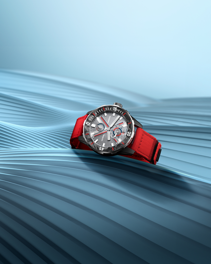 接著是潛水系列Diver NET腕錶旺代環球帆船賽限量版。這款限量300只的紅色腕錶,將永續製錶理念落實於細節之中,錶殼結合回收鋼材與再造碳纖維,紅色織物錶帶則由回收漁網製成。搭載UN自製自動上鍊機芯與矽質擺輪游絲,不僅具備專業潛水性能,也成為品牌環保精神的代表作,紅色點綴在腕間格外吸睛,售價NTD 493,000。