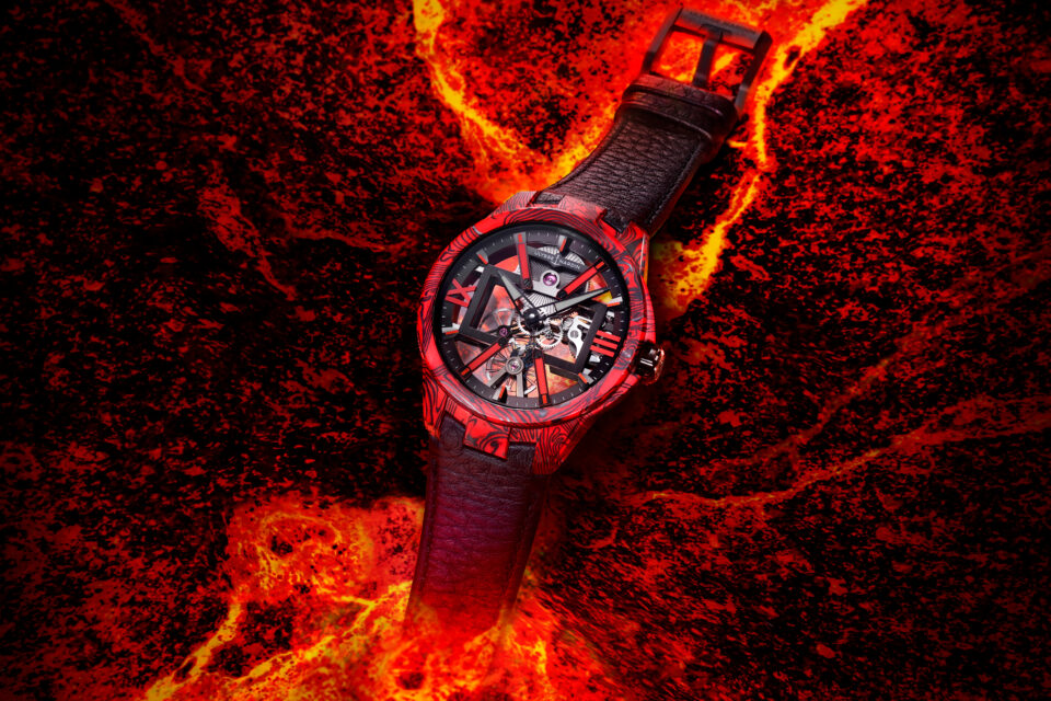首先登場的是視覺張力十足的經理人系列鏤空X岩漿腕錶,43mm超輕碳纖維錶殼融合紅色岩漿紋路,每一只錶殼紋理都是獨一無二。鏤空機芯設計強調機械結構本身的力量感,紅黑配色帶出鮮明運動風格,對於偏好個性化與高性能腕錶的錶迷而言極具吸引力,售價NTD 1,014,000。