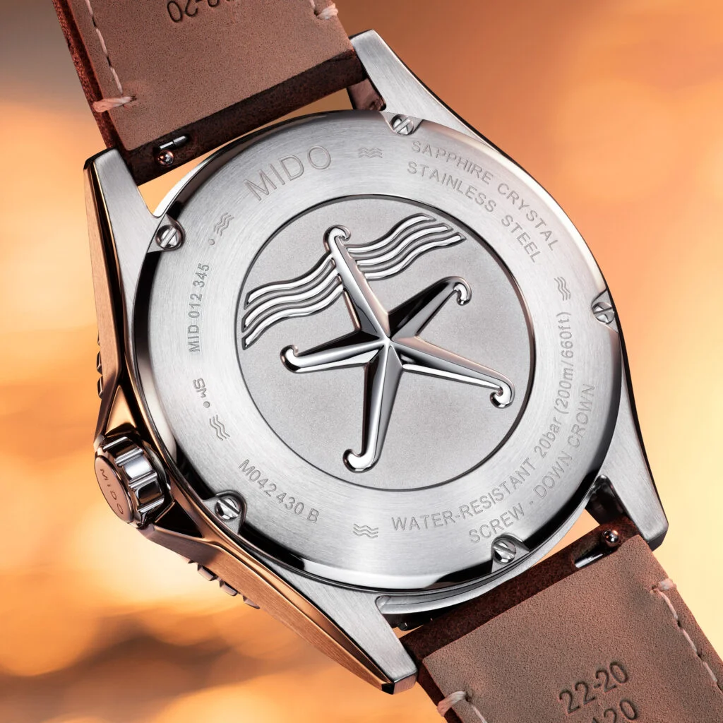 規格方面,這款腕錶延續Ocean Star系列一貫的可靠性。單向旋轉陶瓷錶圈耐磨且刻度清晰,搭配200米防水能力,無論戶外活動或日常佩戴都讓人安心。內部搭載的Caliber 80自動機芯,提供長達80小時動力儲存,加上Nivachron 抗磁游絲,使走時在磁場、溫差與震動下依然穩定。翻到錶背,中央拋光雕刻的海星圖騰立體而清晰。這個自1942年沿用至今的標誌,象徵Ocean Star不畏深海壓力的精神,也與正面熱烈如火的紅色錶圈形成對比。