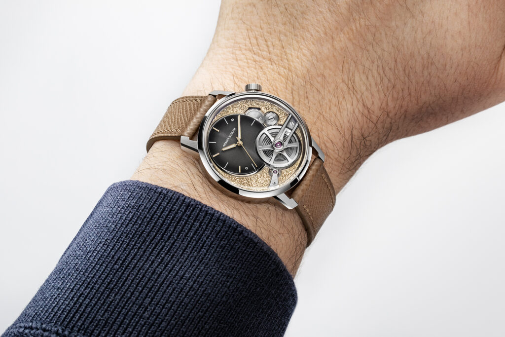 細心欣賞這只新腕錶,映入眼簾的是鍍金tremblage顫點工藝主夾板。這種極為罕見的手工雕刻手法,透過不規則的細微紋理,讓光線在錶盤上產生層次變化。搭配灰色煙燻效果的偏心錶盤與層疊結構,帶領我走進機芯的建築美學。搭載品牌自製的AMW21手動上鍊機芯,擁有長達100小時的動力儲存。關鍵在於創新的發條盒結構,透過發條軸心直接傳遞能量,達致每小時25,200次振頻、不僅提升效率,也讓機芯佈局更為開闊。