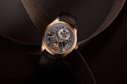 新作採用直徑40毫米紅金錶殼,厚度10.7毫米,錶殼側面沿用Endeavour系列標誌性不對稱線條,並以拉絲與拋光交錯處理,在優雅比例中保留強烈辨識度。機芯經全面鏤空處理,以深灰色調的主夾板與橋板構成富有建築感的幾何結構,鏤空之美一覽無遺;金色立體時標與葉形指針懸浮其上,塑造高對比而仍易讀的視覺效果,即使採用鏤空設計,整體視覺依然簡潔純粹。6時位置的一分鐘飛行陀飛輪是整枚腕錶的視覺焦點,搭載HMC 814自動機芯,配備由品牌姊妹公司Precision Engineering AG自主設計與生產的雙游絲,並提供72小時動力儲存。