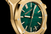 Audemars Piguet推出兩款孔雀石錶盤的Royal Oak Selfwinding,以黃金材質製作,有37毫米與41毫米兩種錶徑可選擇。孔雀石以鮮明色彩與獨特條帶紋理聞名,其層疊綠色源自晶體結構與銅元素含量的變化,每一枚錶盤皆獨一無二。
