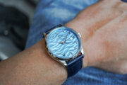 原來藍色與中東元素,也不是簡單的美學設計,背後也有其意思。因為藍色在中東象徵守護與智慧,也是夜空與星辰的顏色。而這枚WEEKEND ARCTIC DUNES蒼域之丘大三針腕錶,更特別在錶盤加上浮雕紋理,既像水波也像風刻出的沙丘,讓我想起在沙漠與海岸之間流動的世界,兩種看似對立的風景,卻一同描述時間的形狀,同時又比一般冰藍色面盤更加與眾不同。隨著手腕轉動,光在面盤上緩緩滑行,構成紋理與光線的不張揚變化,讓人由閱讀時間變成感受時間。
