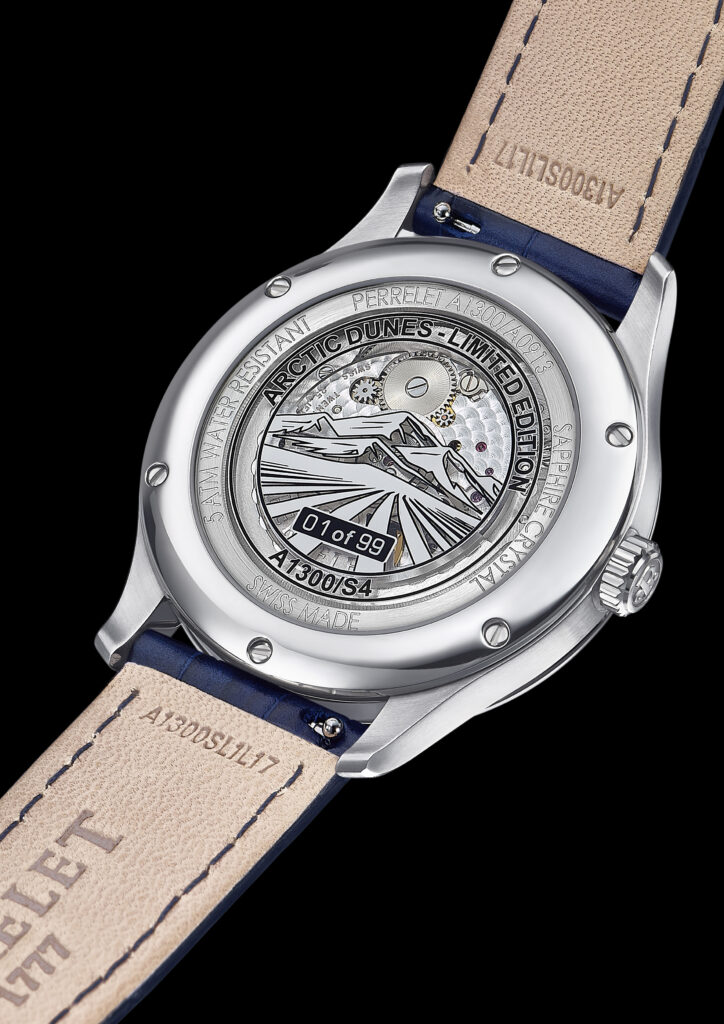 39毫米的精鋼錶殼比例恰到好處,厚度僅9.56毫米,貼腕而舒適,男女佩戴同樣合適。拋光與拉絲交錯的處理,在不同角度呈現細膩層次;5 ATM防水與藍寶石水晶玻璃,則保有日常佩戴的安全感。翻到背面,透明底蓋刻著沙丘圖案與「LIMITED EDITION 01 OF 99」字樣,就像一幅私人的微型風景。機芯搭載自製P-321自動上鏈機芯,42小時動力儲存穩定可靠,透過底蓋可見魚鱗紋打磨與鍍銠自動盤,雖說不上是頂級工藝,卻與面盤彼此呼應,風格統一。