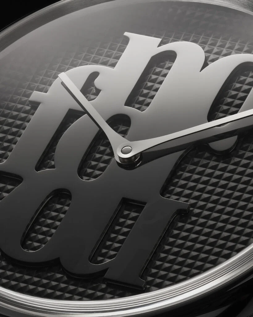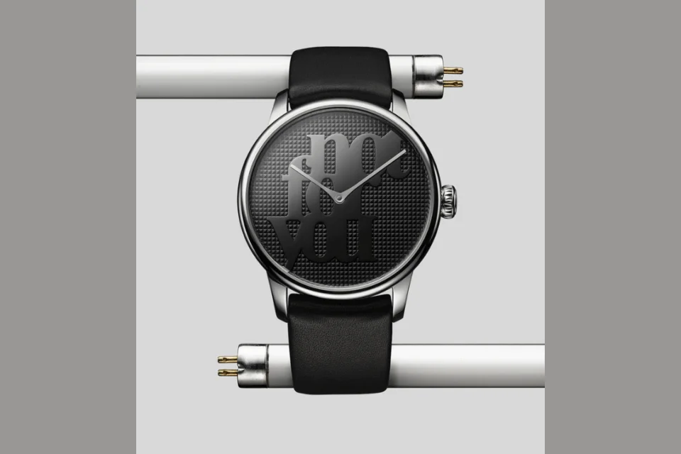 Bonvicini的創作向來直率而不妥協,總在質疑權力與性別框架。這樣的精神,被Louis Erard團隊轉化得極為到位。面盤上以立體字樣呈現Bonvicini作品中常見的宣言“not for you”,配合拋光鏡面,讓人在試戴時甚至能看見自己的倒影,彷彿正在反問:「那你呢?」霧黑巴黎釘紋機刻背景,令文字從黑暗中切割而出,層次分明,也呼應藝術作品中常見的釘子與皮革意象。鍍銠纖細指針在面盤上安靜運行,沒有多餘裝飾,卻讓整體更像一段精心編排的視覺敘事。